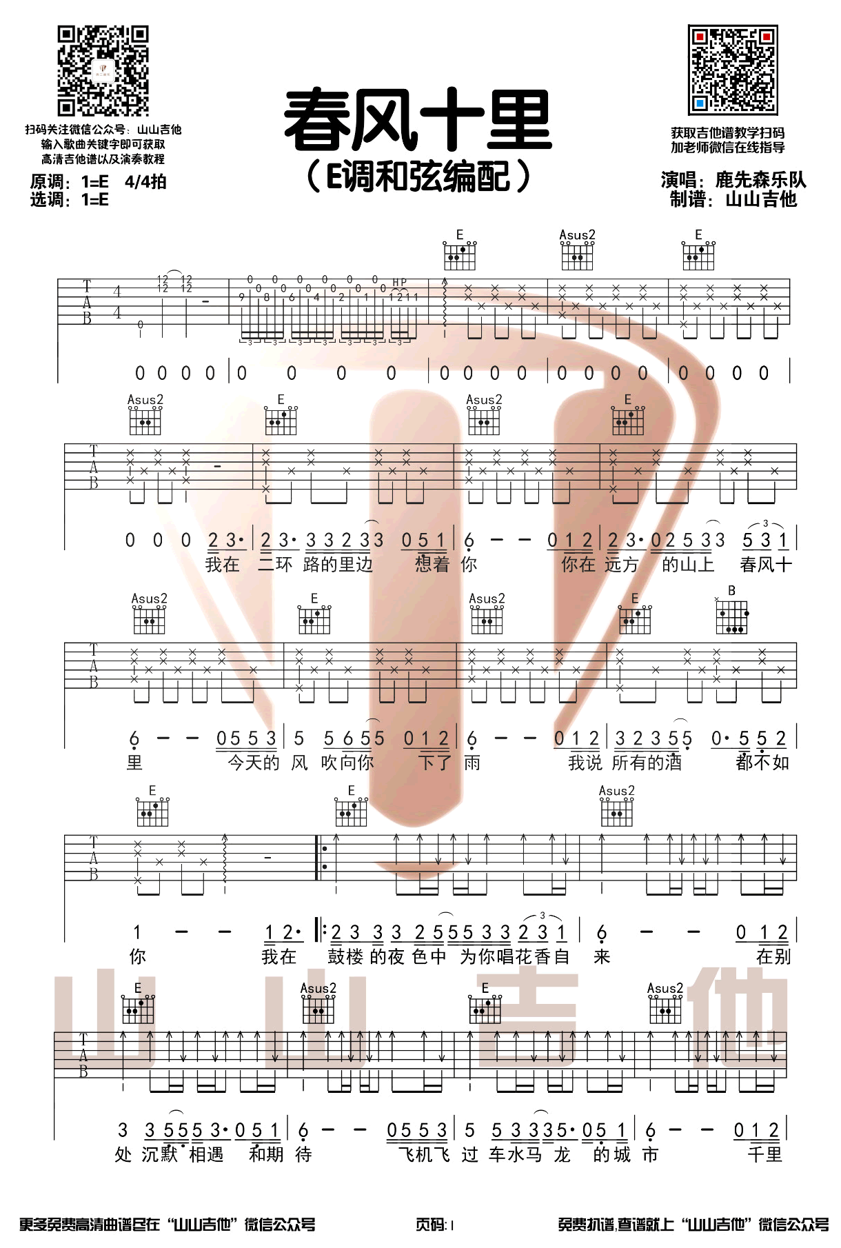 E调和弦编配,三张弹唱图片谱,山山吉他制谱分享...