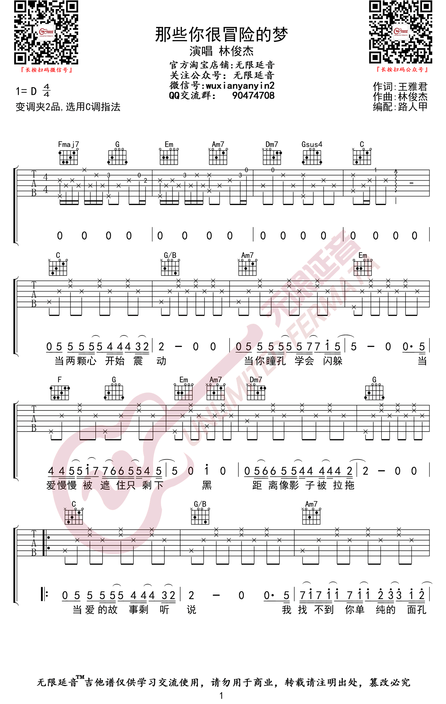 原调D,变调夹夹第二品,选用C调指法。三张弹唱图片谱,无限延音编配...