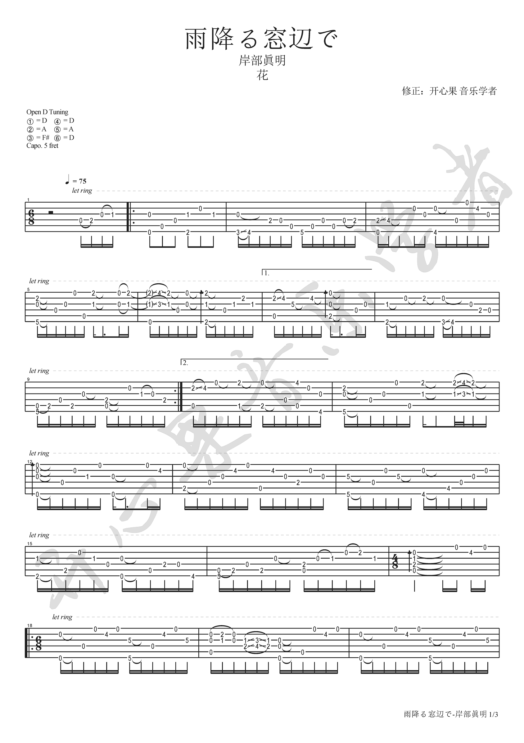 雨降る窓辺で吉他独奏谱,曲调优美清新,旋律流畅动听。三张高清图片谱,三拍子富于动感的情绪,把窗外的雨声,缓缓送入耳边,无限遐想。开心果音乐学者改编...