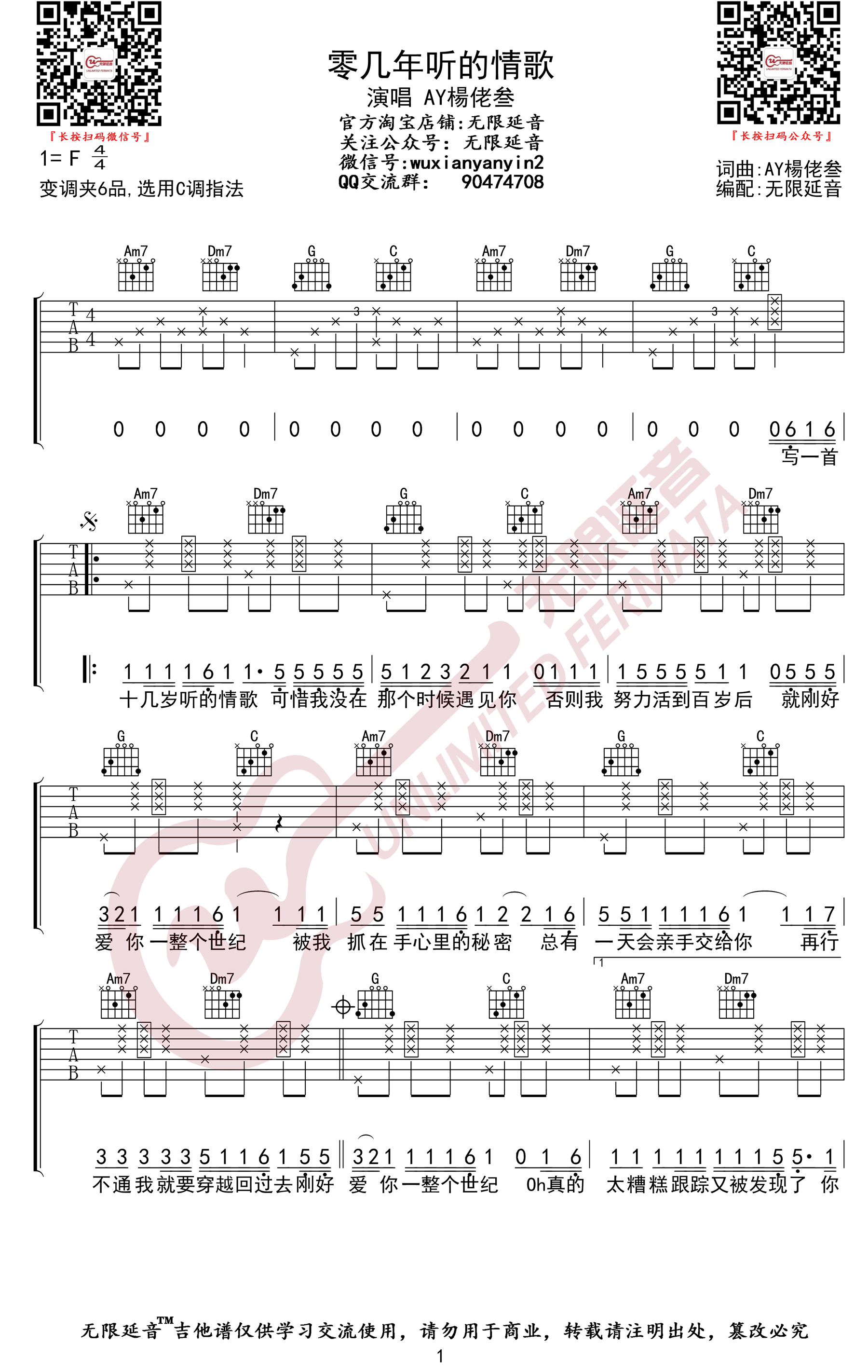 原调F,变调夹夹六品,选用C调指法。零几年听的情歌六线谱,三张高清弹唱图片谱,无限延音编配出品...