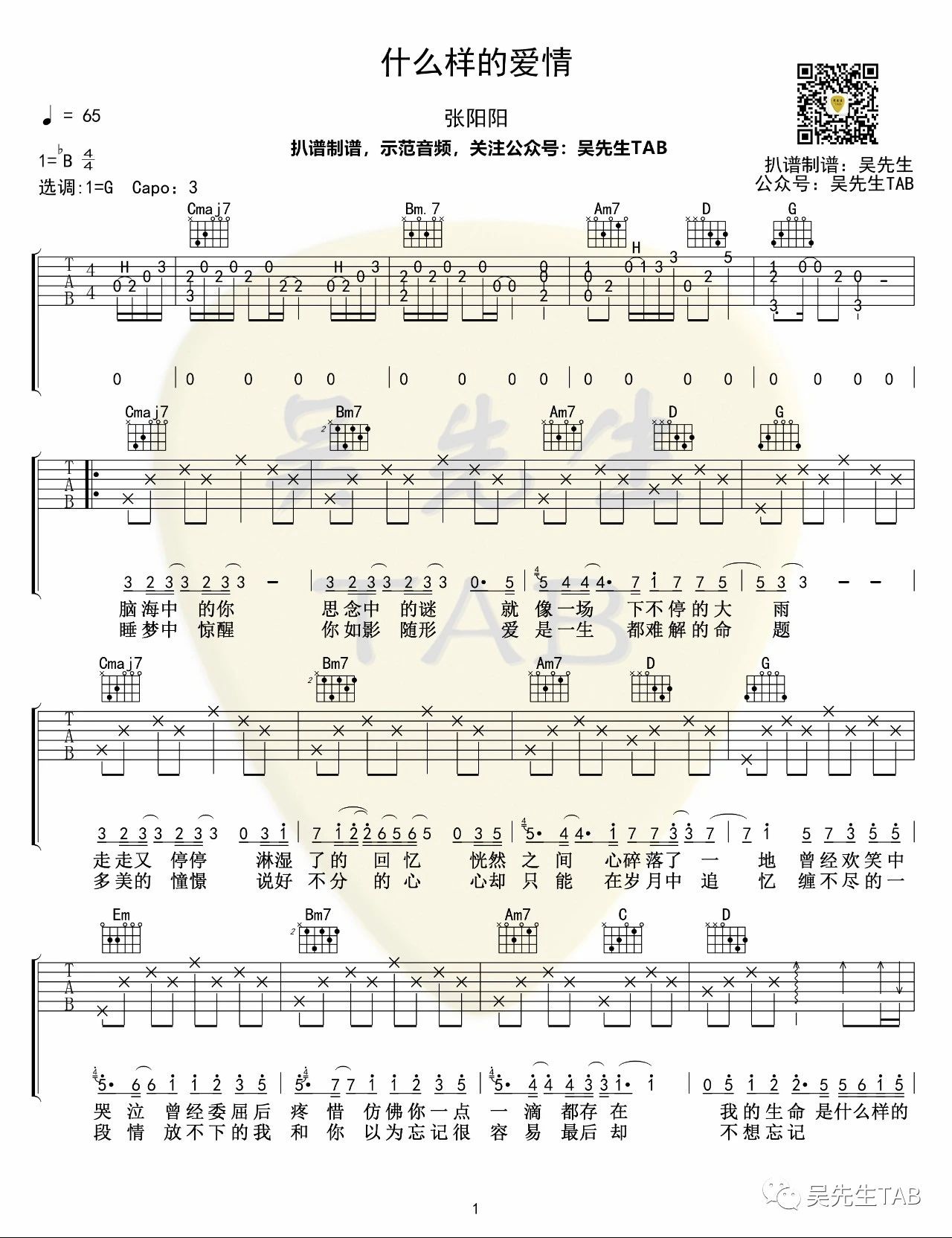 吉他张阳阳《什么样的爱情》吉他谱 G调弹唱谱