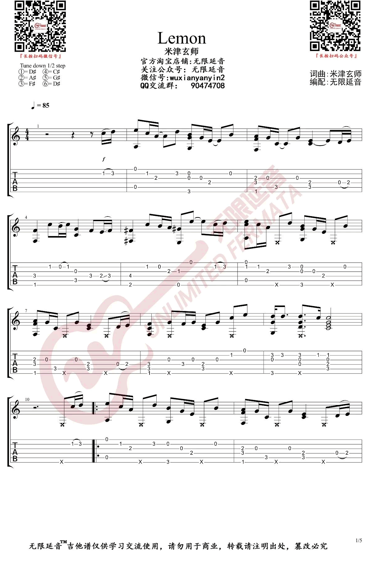 米津玄师的一首代表曲目,LEMON吉他独奏谱,完整版共五张图片谱。感谢无限延音编配出品...