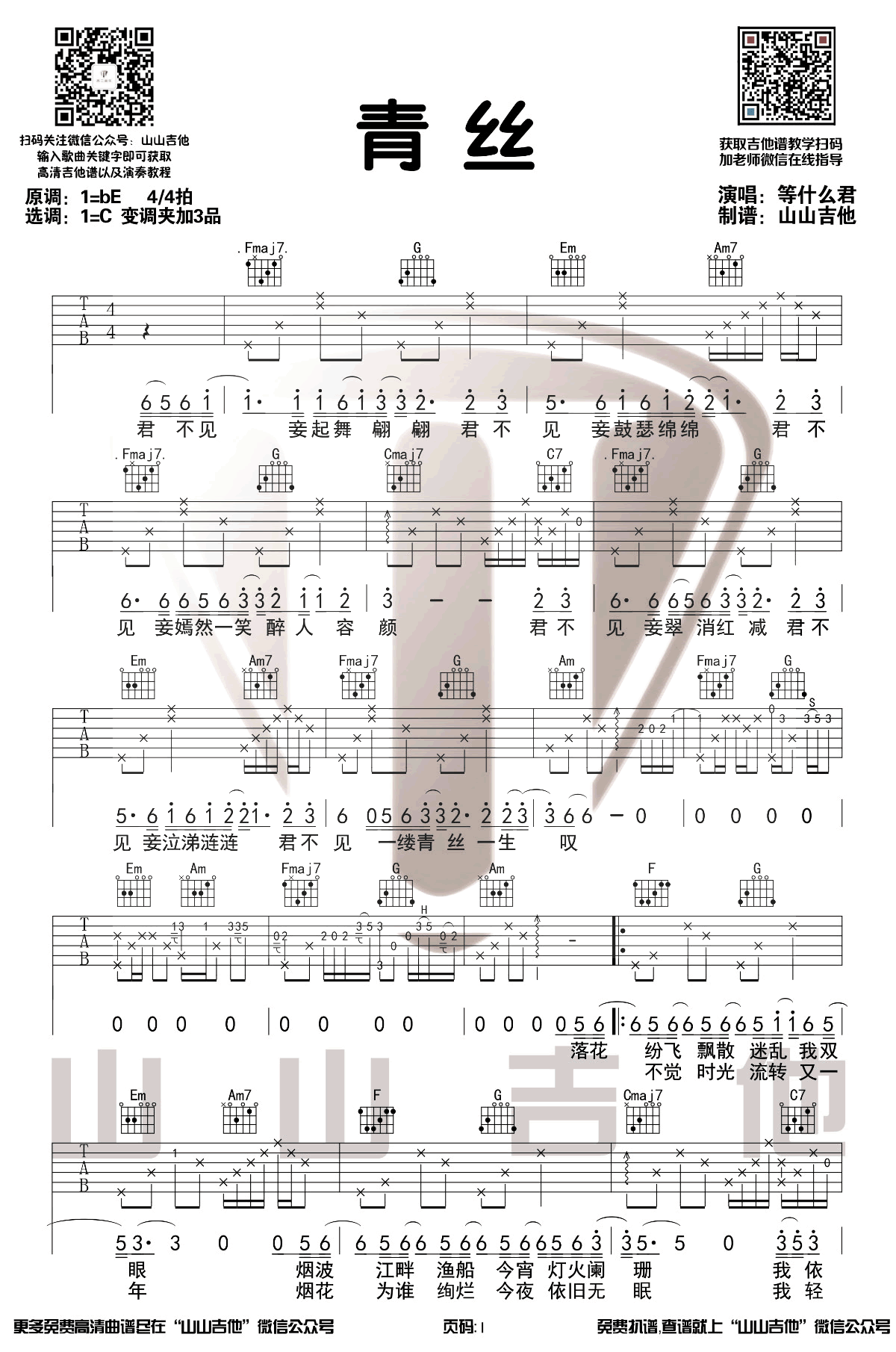 等什么君翻唱的一首古风歌曲,原调bE,选用C调,变调夹夹三品。青丝六线谱,三张图片谱,感谢山山吉他编配出品...