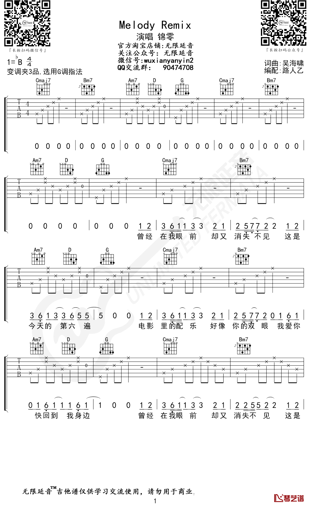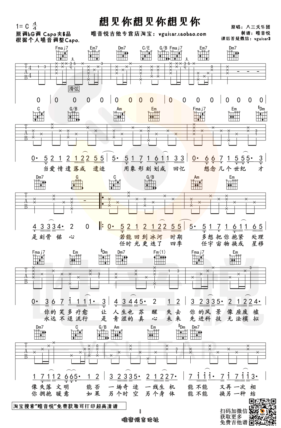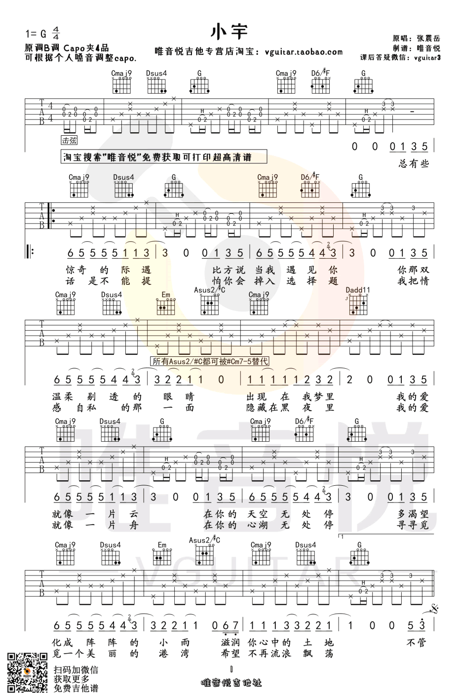 原调B调,选用G调指法,变调夹夹四品,也可以根据个人嗓音调整capo。小宇六线谱,三张弹唱图片谱,唯音悦改编制谱...