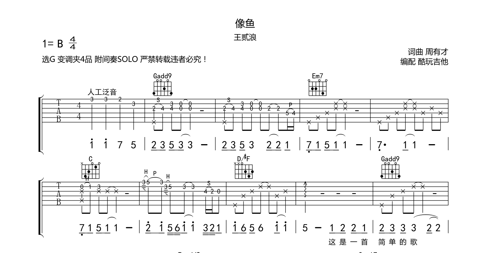 像鱼吉他谱-王贰浪-附间奏SOLO-弹唱谱变调夹4品音频为手机录制只是录制了前奏以作试听示范一定程度还原了效果人工泛音技巧请参考网络教学附带完整solo(按照变调夹4品的把位演奏)...