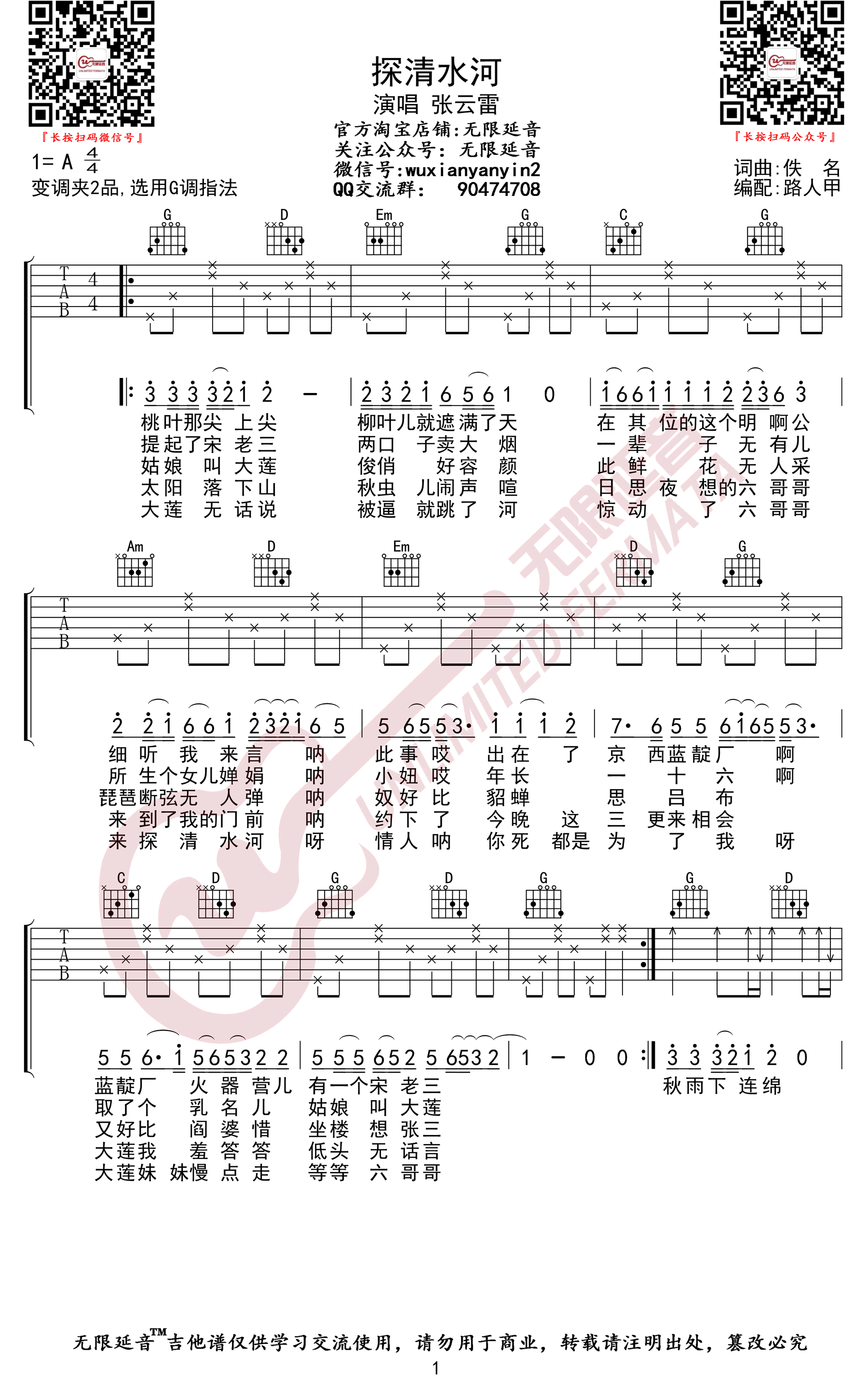 原调A,选用G调指法,变调夹夹第二品。一首传统的民国北京小调改编,探清水河六线谱,高清弹唱图片谱,无限延音编配...