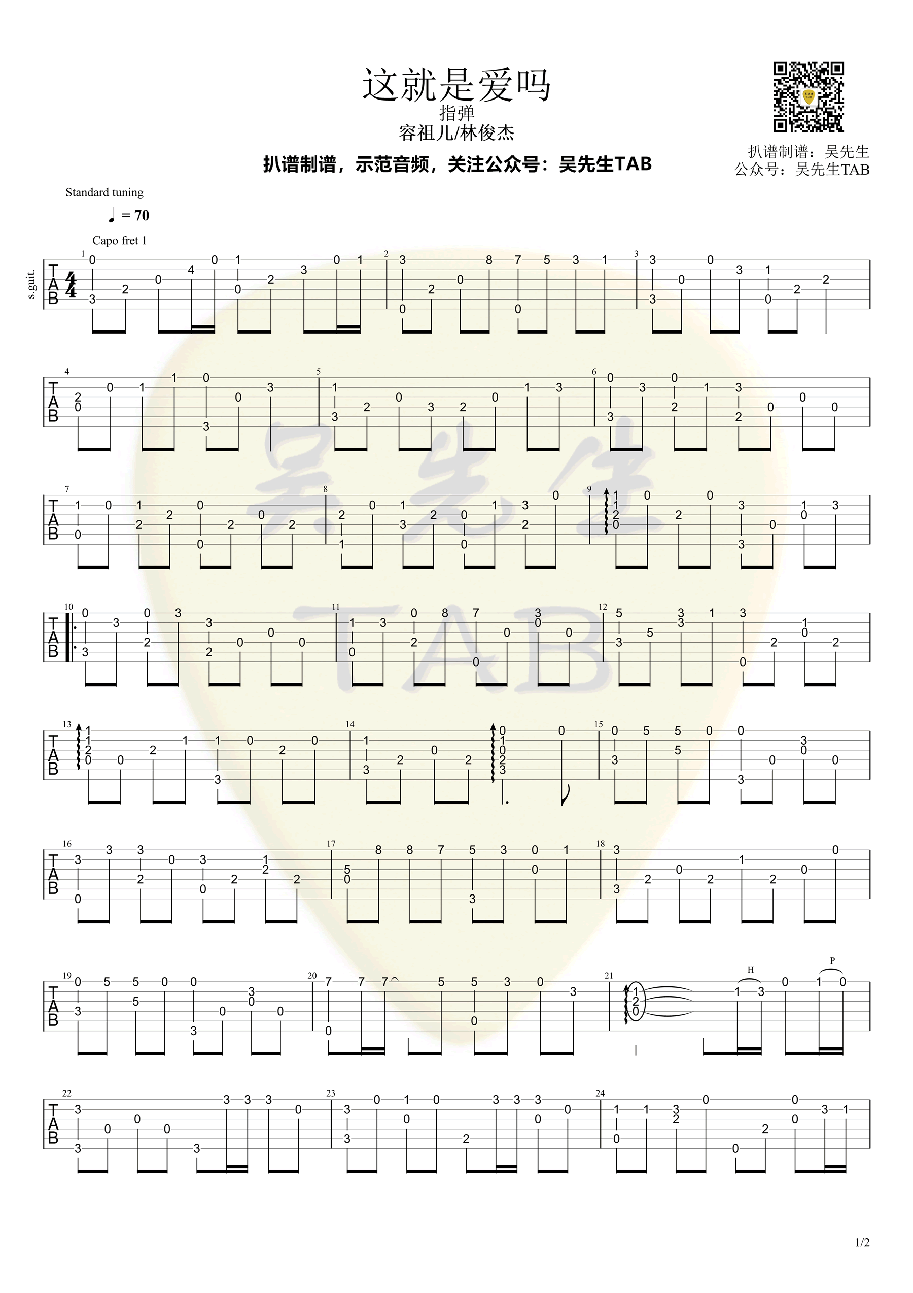 指弹谱,容祖儿的一首经典老歌改编,因为翻唱而重新成为网络爆款热门歌曲。这就是爱吗吉他独奏谱,两张高清图片谱,吴先生扒谱制作...