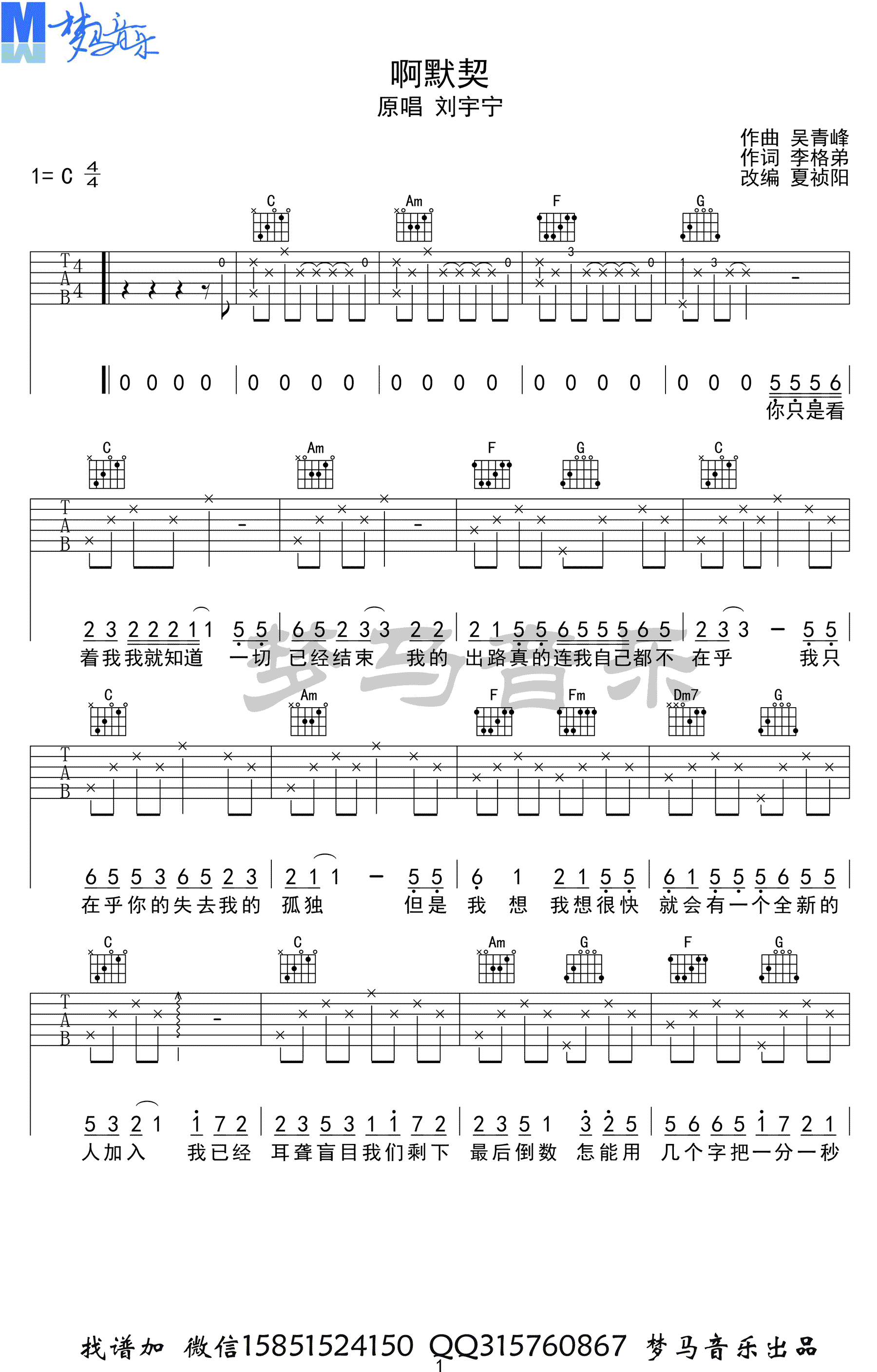《啊默契》吉他谱,摩登兄弟刘宇宁演唱,啊默契六线谱,梦马音乐编配分享...