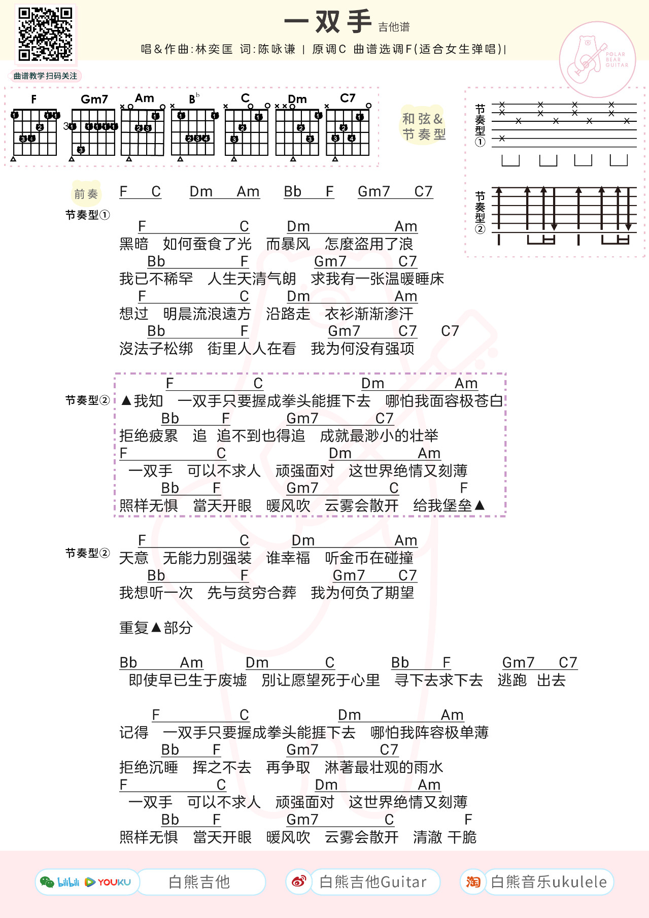 吉他林奕匡/阿细《一双手》吉他谱 C&F调和弦谱附节奏