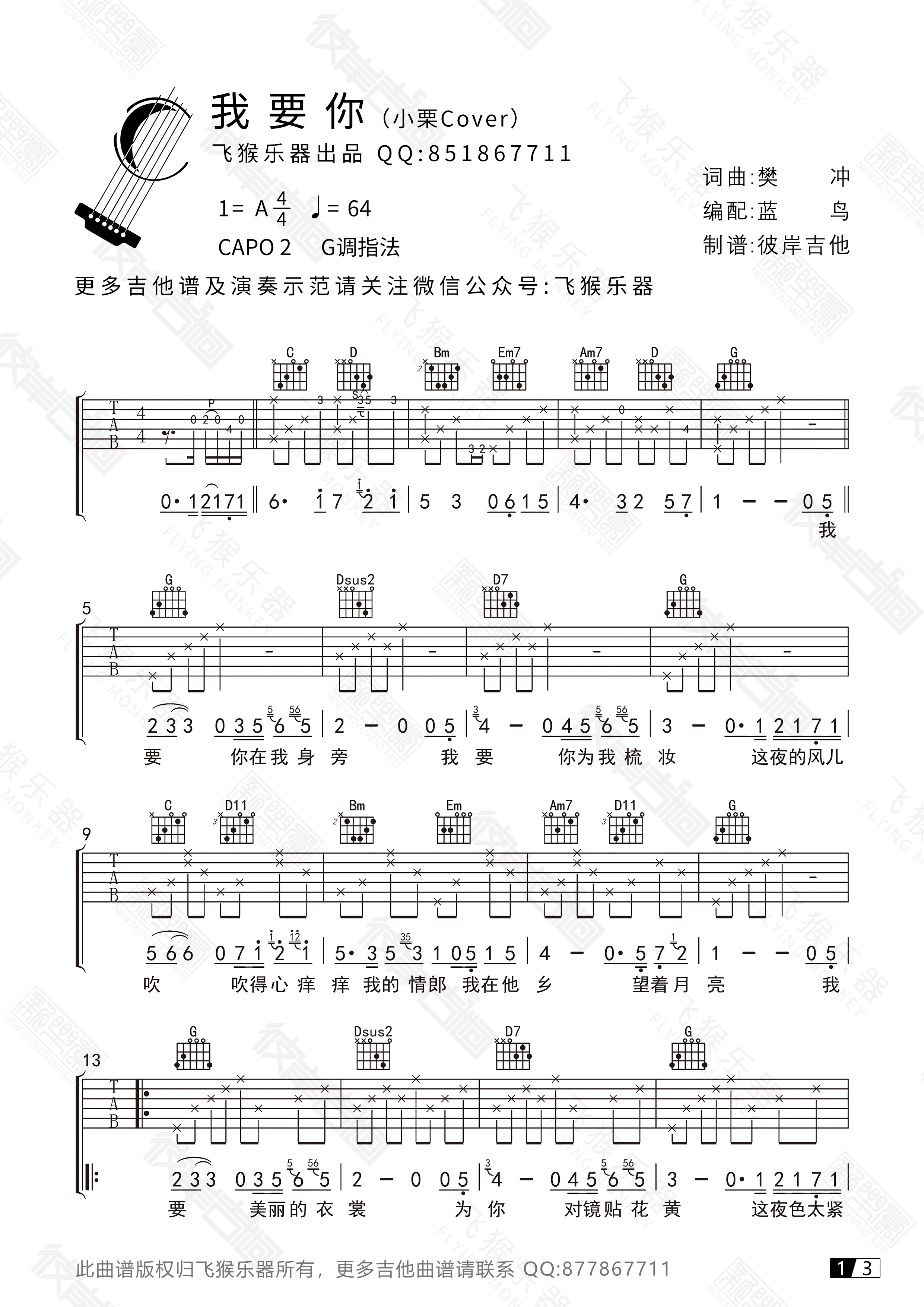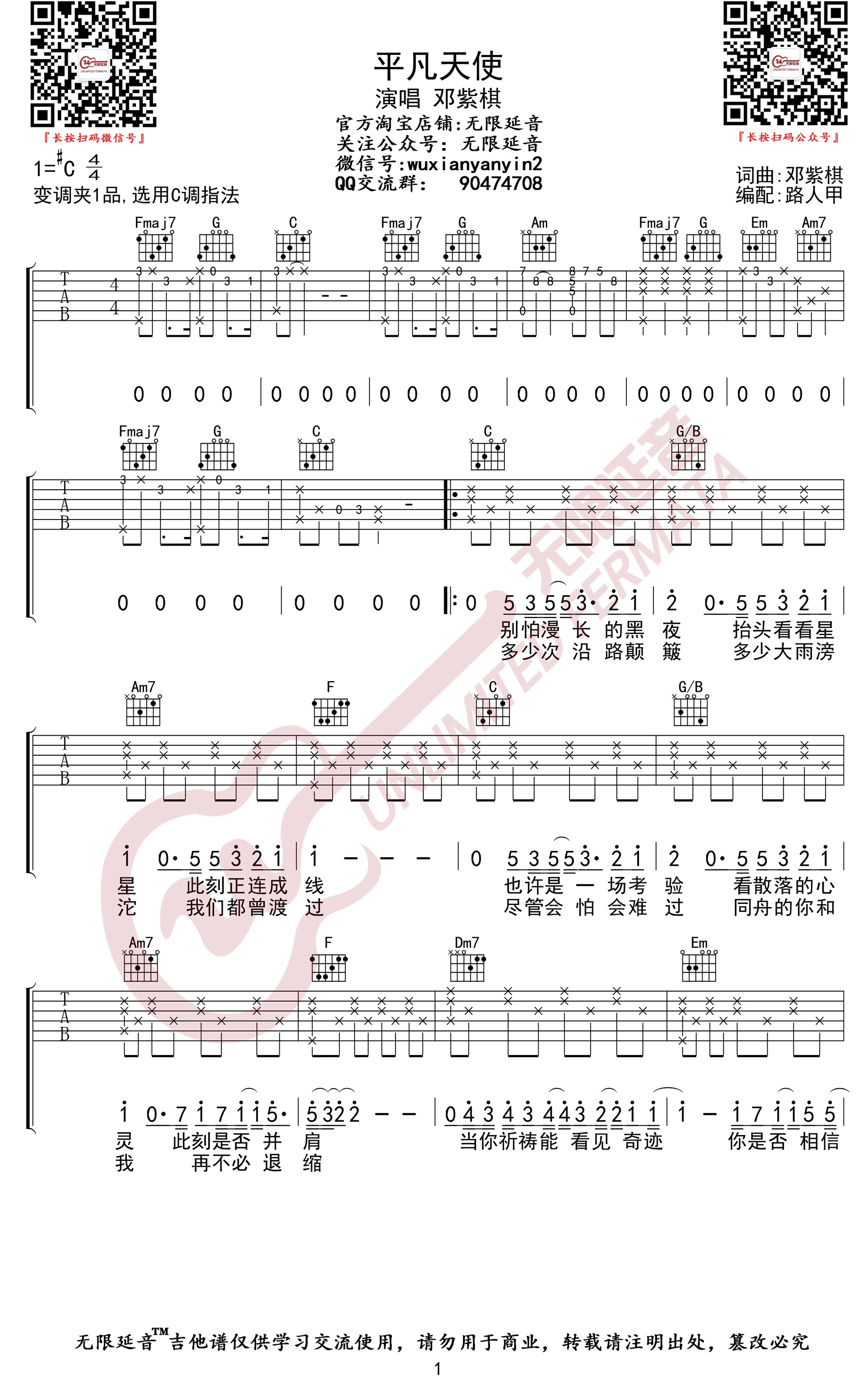 原调升C,变调夹夹一品,选用C调指法编配。平凡天使吉他弹唱谱,两张高清图片六线谱,无限延音出品...