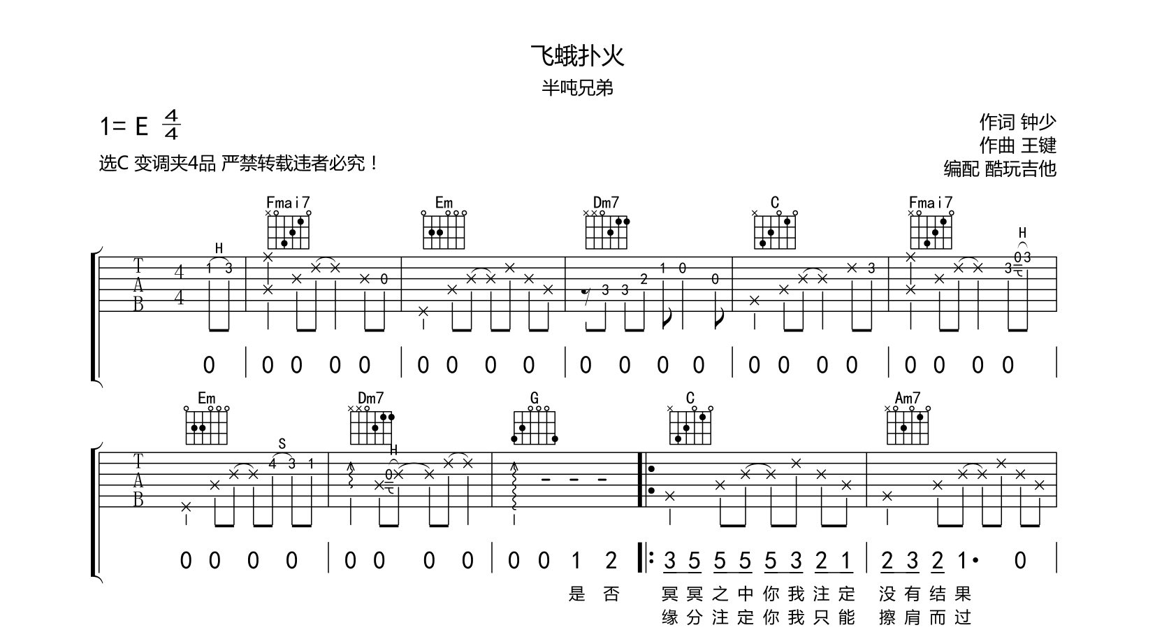飞蛾扑火吉他谱-半吨兄弟-附前奏间奏-弹唱谱变调夹4品音频为手机录制本人不会唱只能哼歌大概音频用合板琴示范了一整遍以作试听...