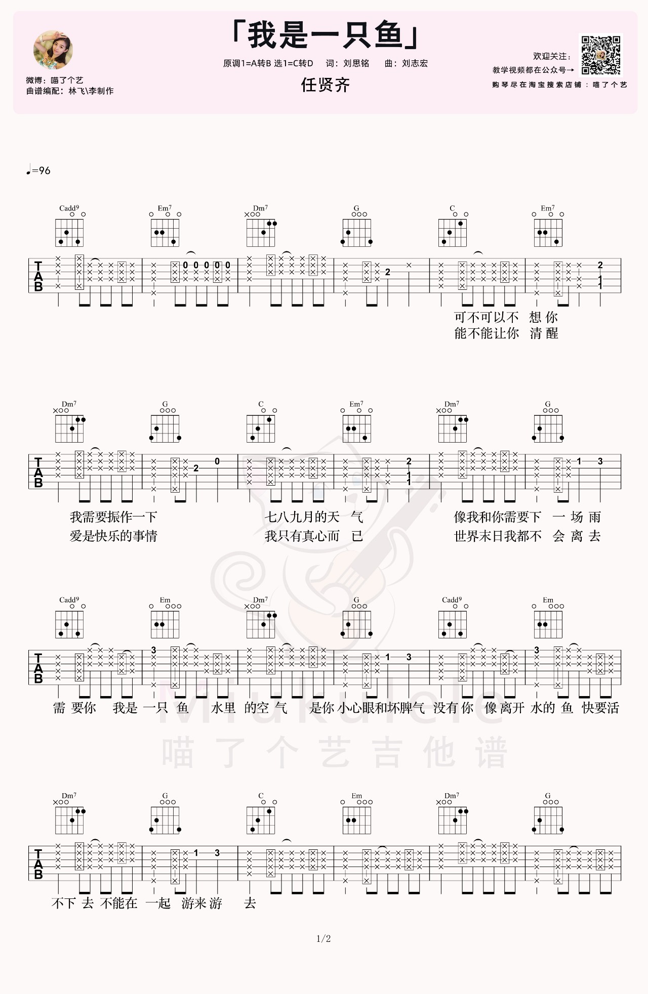 吉他 任贤齐《我是一只鱼》吉他谱 C转D调弹唱谱