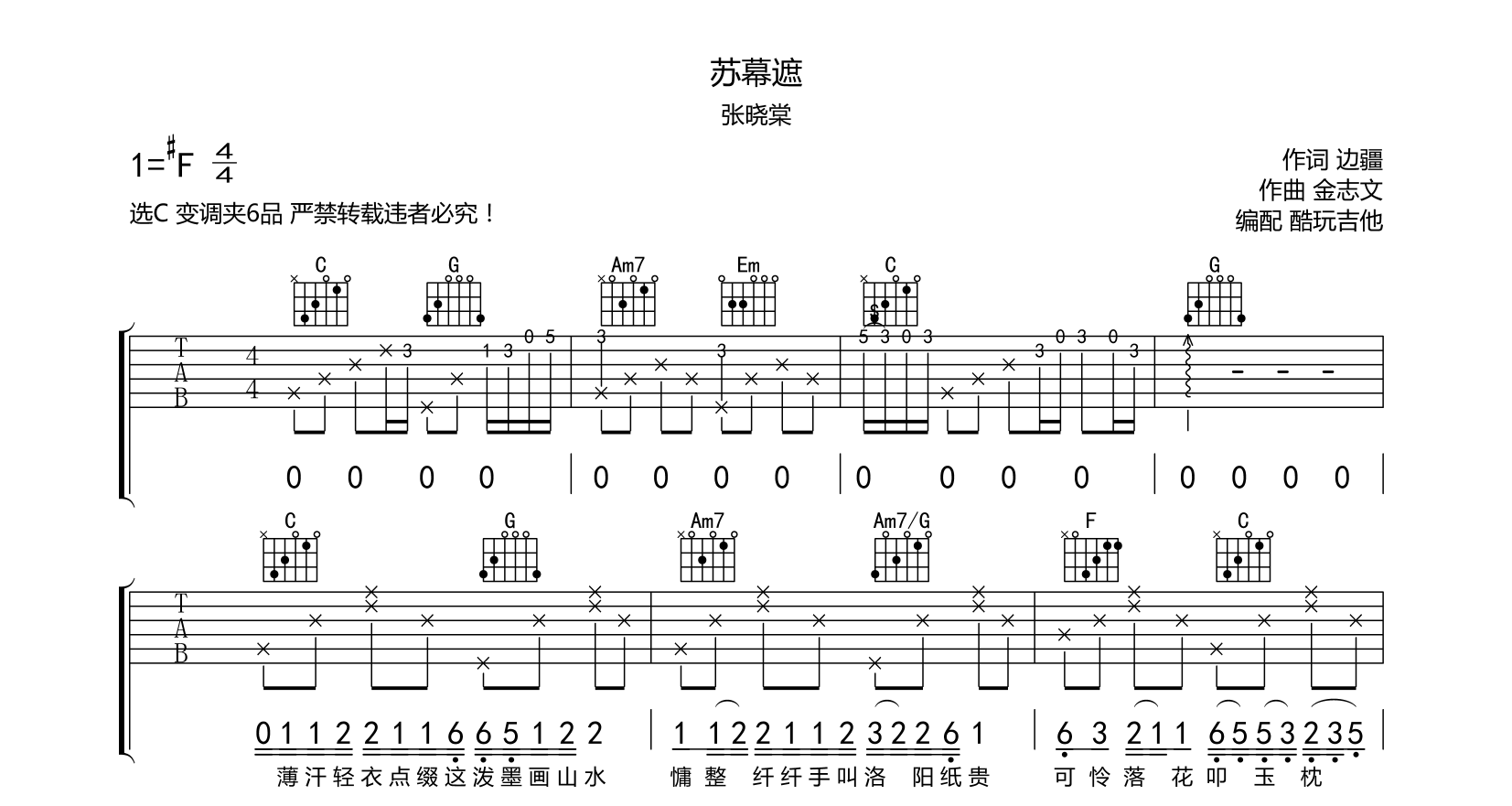 吉他苏幕遮吉他谱-张晓棠-原版编配-全网首发