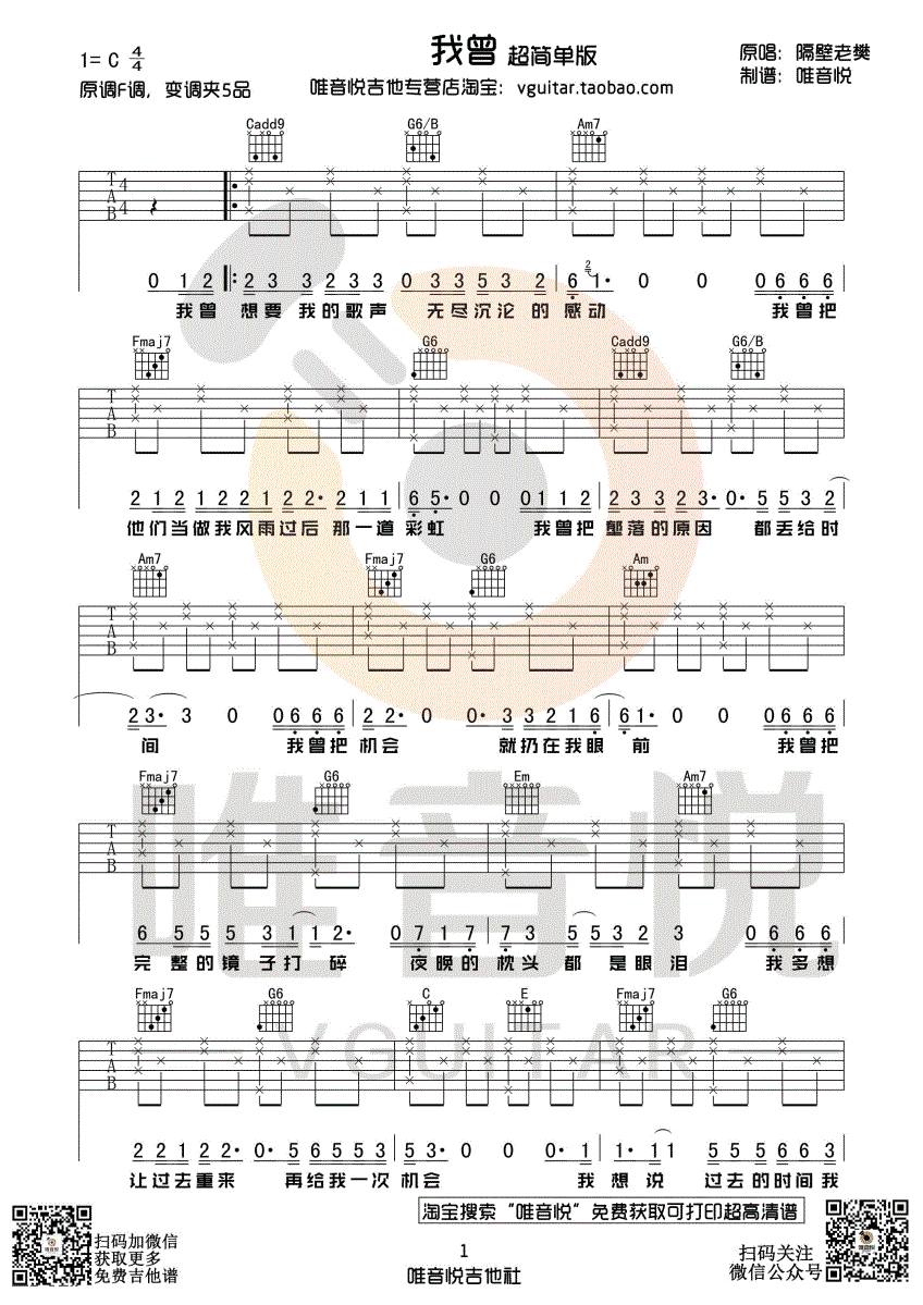 吉他隔壁老樊 - 我曾- 弹唱 C调 简单版-吉他谱-5个版本