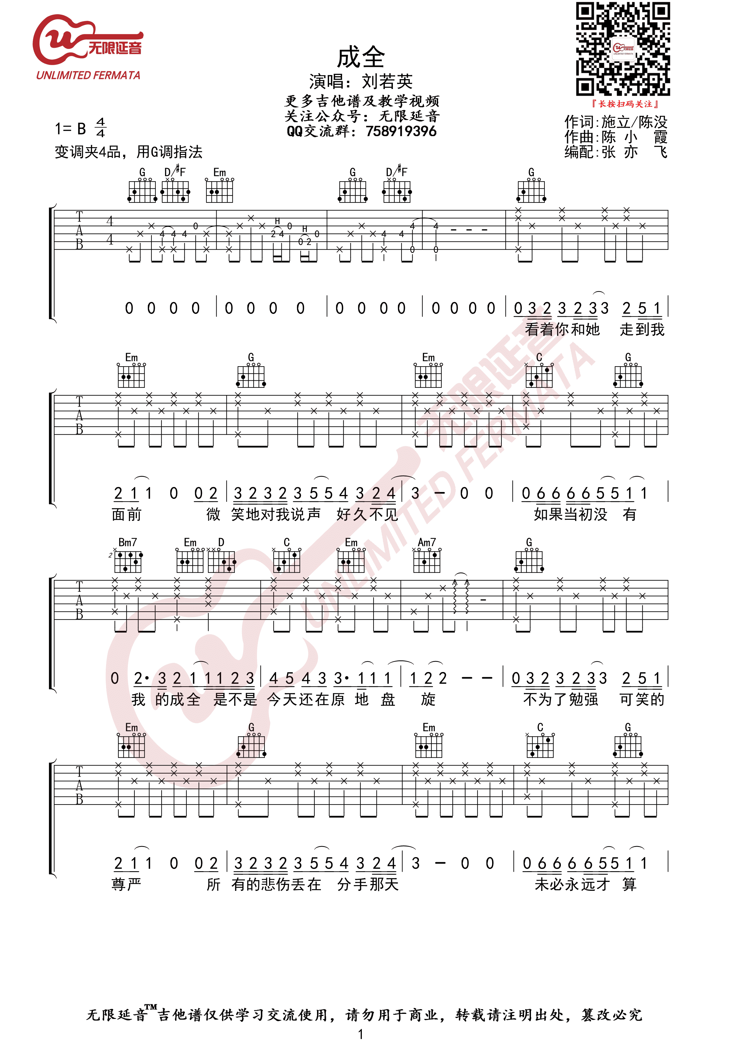 吉他刘若英 - 成全 [无限延音编配 弹唱] 吉他谱-4个版本