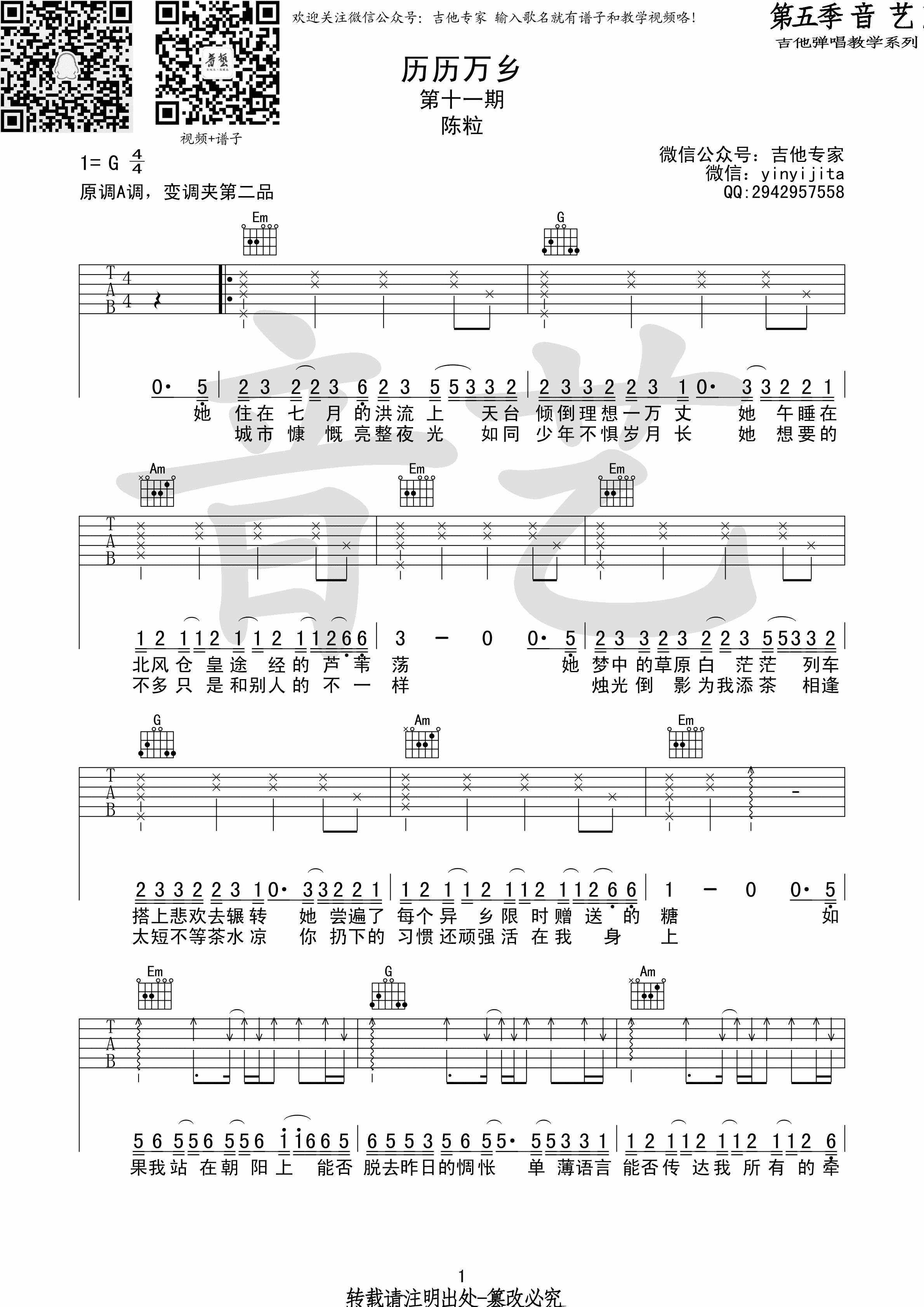 G2er版本,任贤齐的一首经典老歌,还有我吉他六线谱,原调bE,选调C,变调夹夹三品。山山吉他编配...
