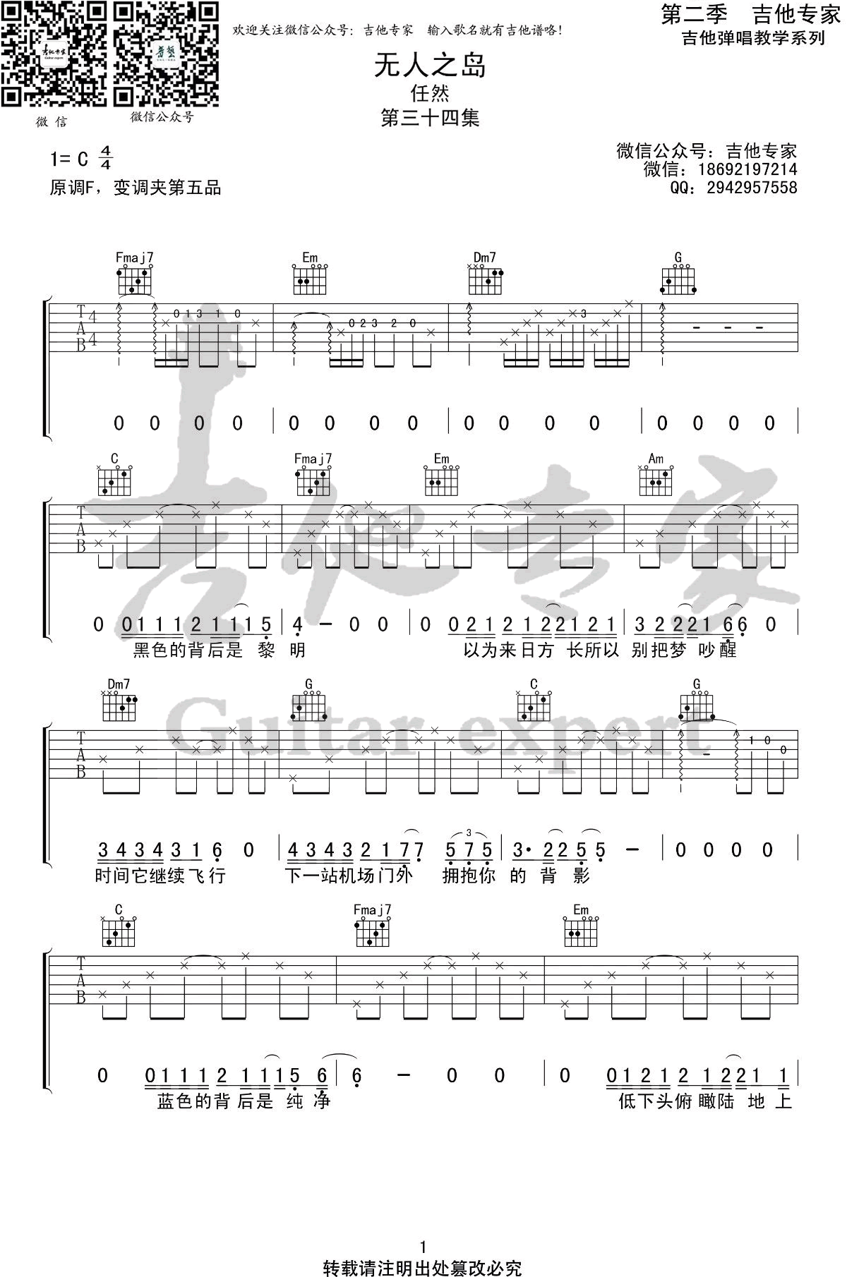 原调F,变调夹夹五品,选用C调指法。男声不加变调夹应该比较舒服。无人之岛六线谱,三张弹唱图片谱,吉他专家编配...