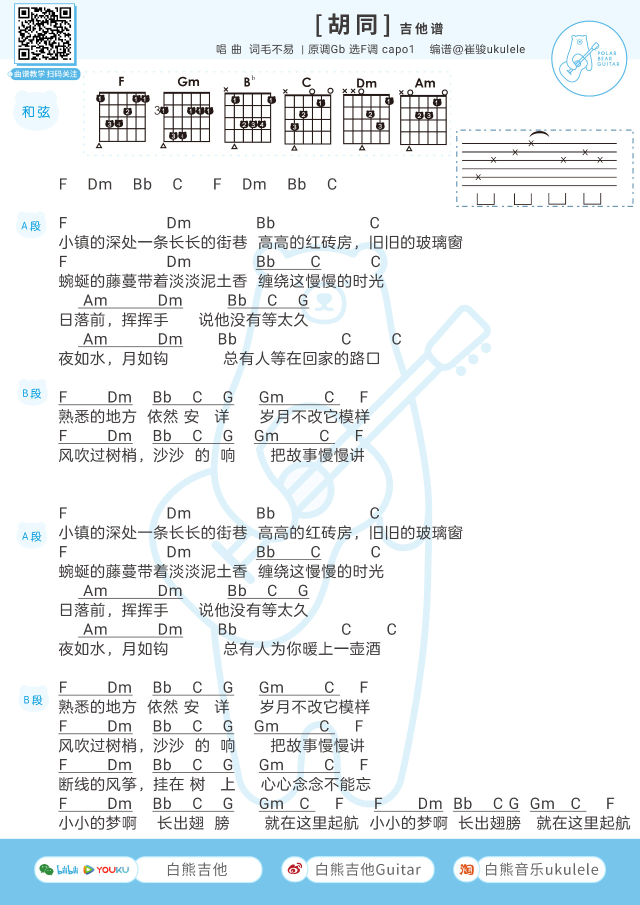吉他毛不易《胡同》吉他谱 F调和弦谱
