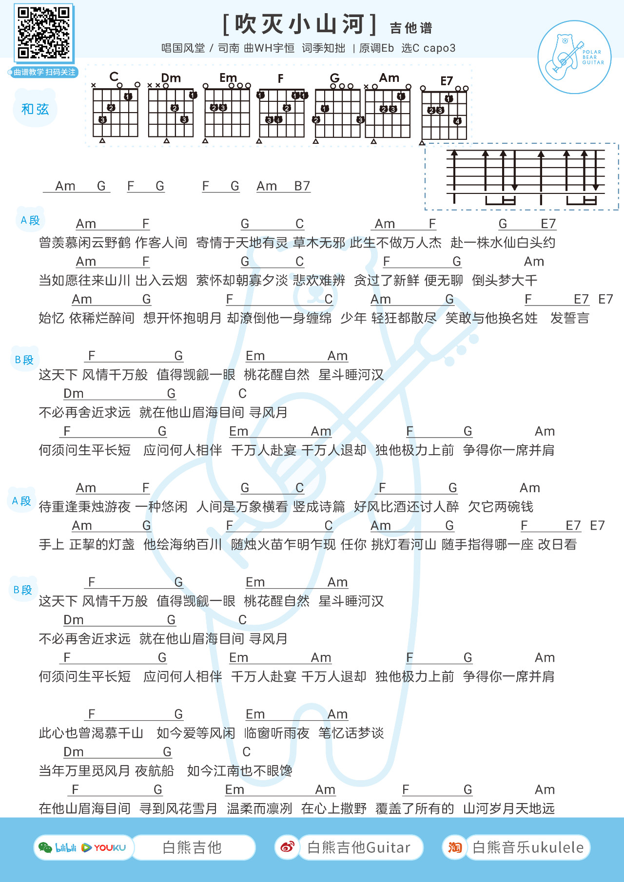 吉他风堂/司南 《吹灭小山河》吉他谱 C调和弦谱附节奏