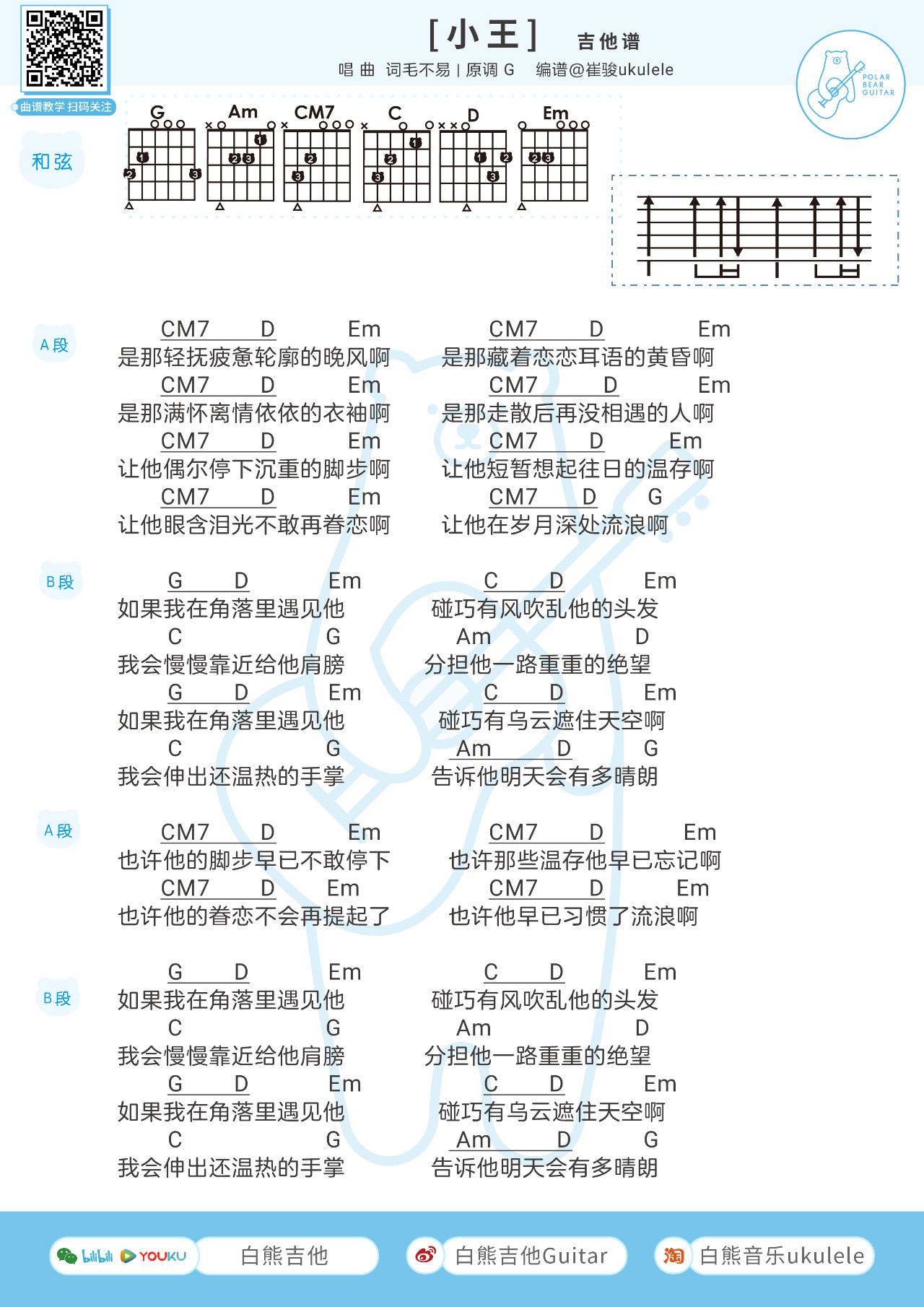 吉他毛不易《小王》吉他谱 G调和弦谱附节奏