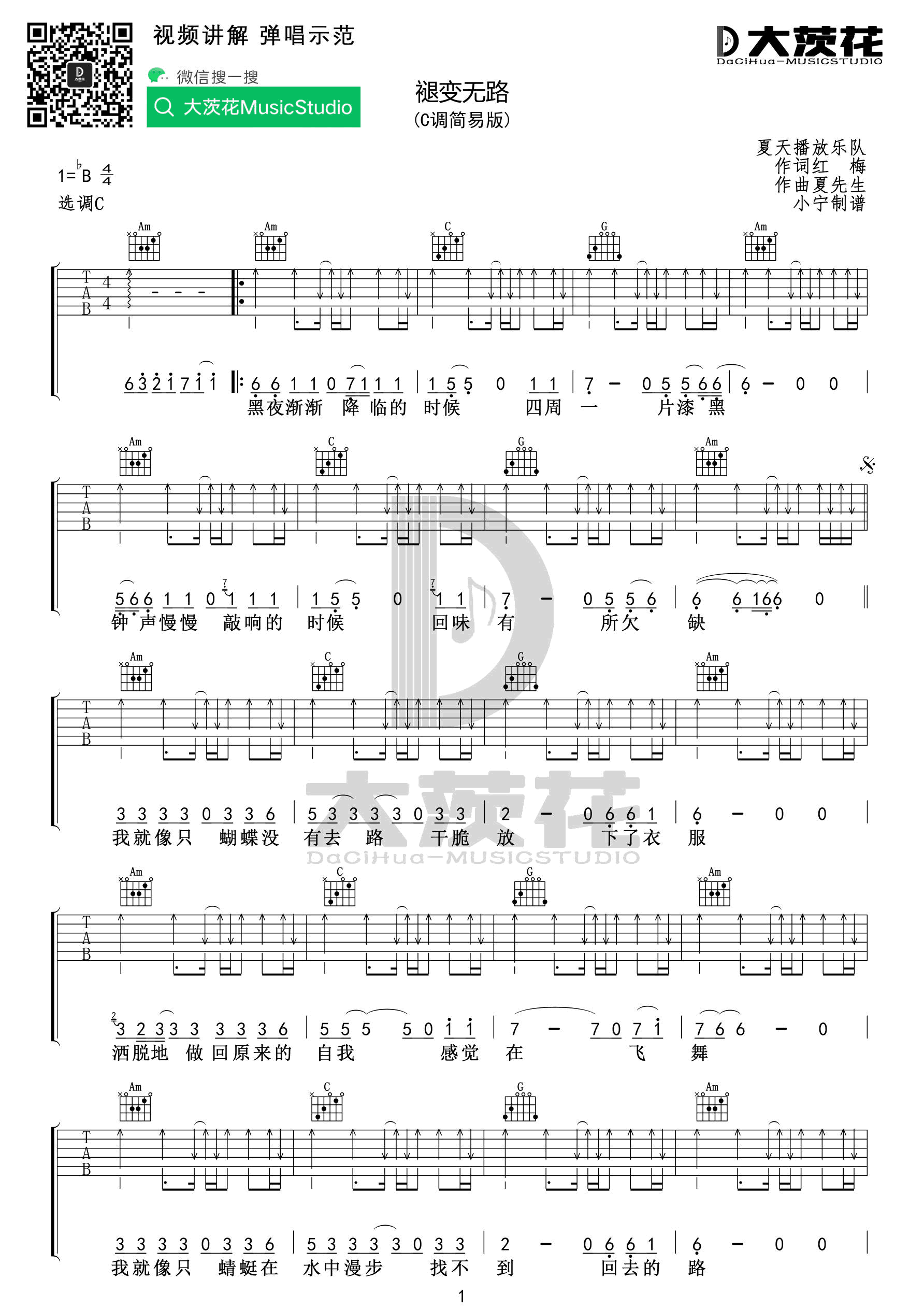 原调bB,选调C,简易版编配,褪变无路六线谱,大茨花音乐工作室制谱分享...