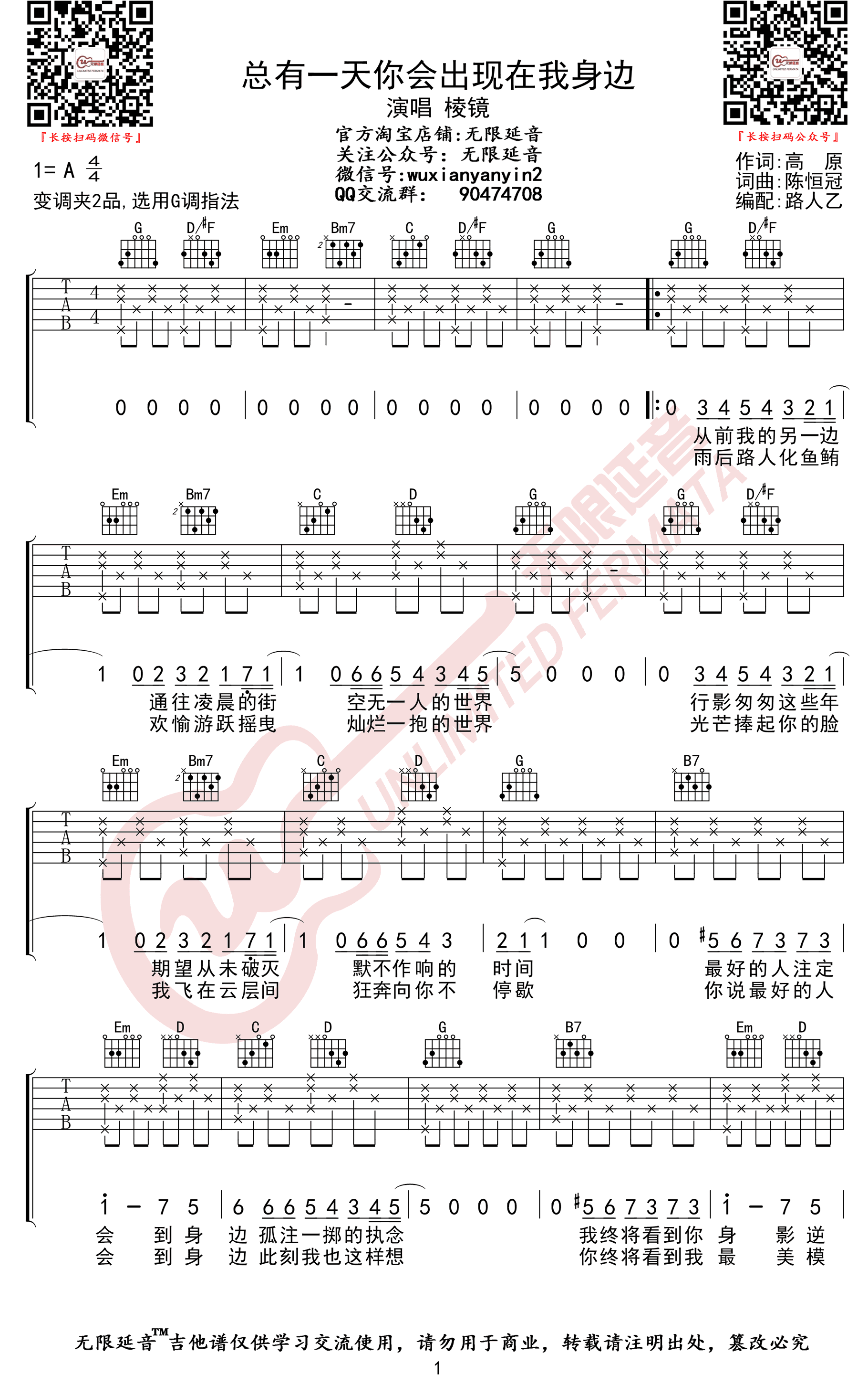 原调A选用G调指法,变调夹夹第二品。总有一天你会出现在我身边六线谱,高清弹唱图片谱,无限延音编配...