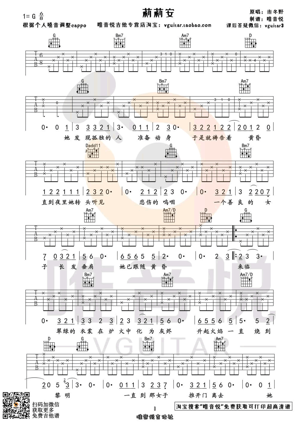 吉他莉莉安吉他谱_宋冬野_G调原版_简单弹唱谱
