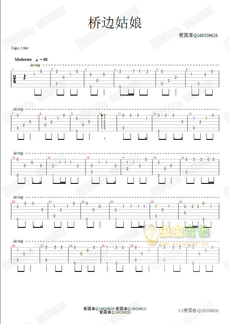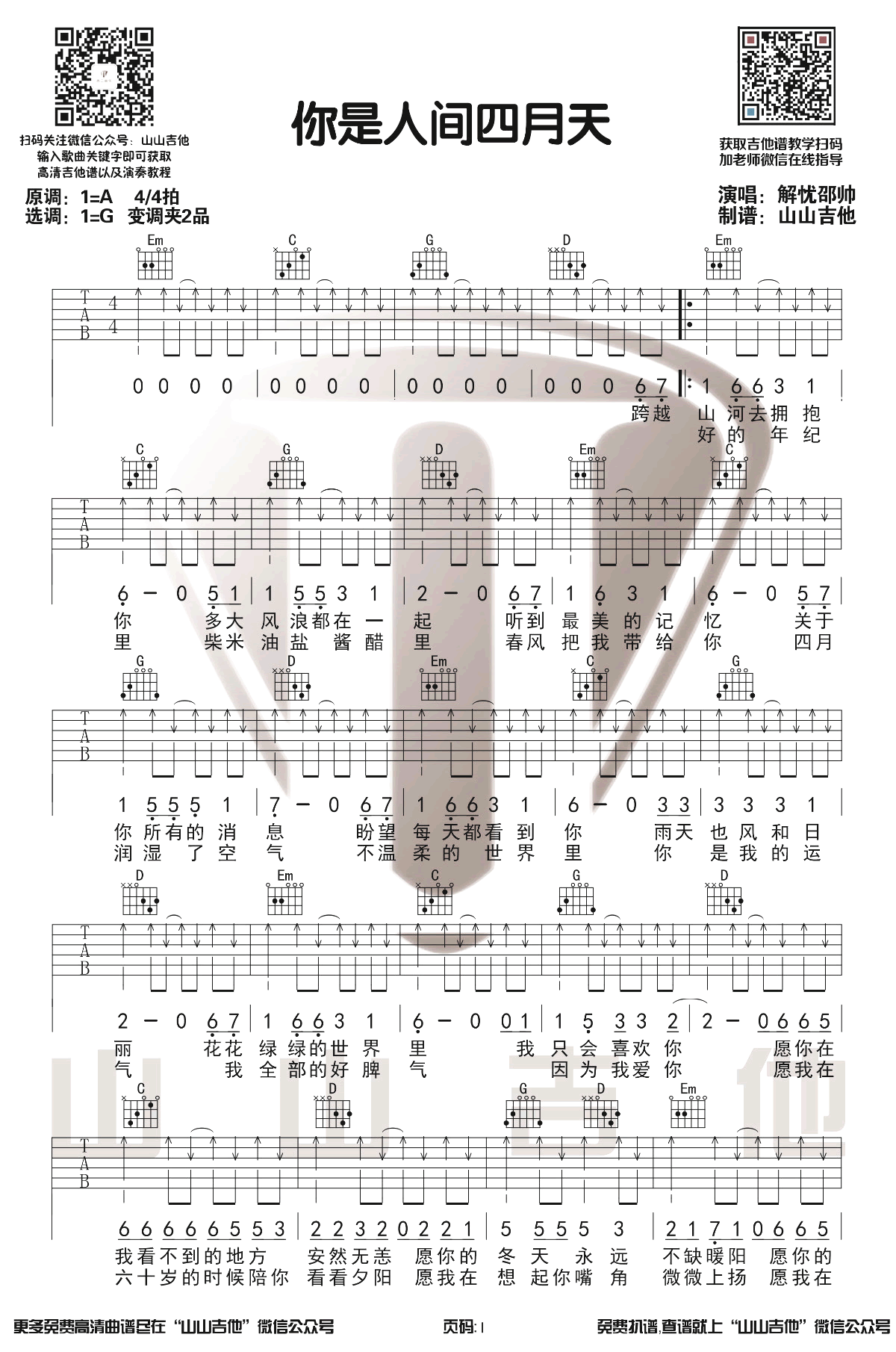 原调A,选调G,变调夹夹第二品。三张图片六线谱,山山吉他出品...