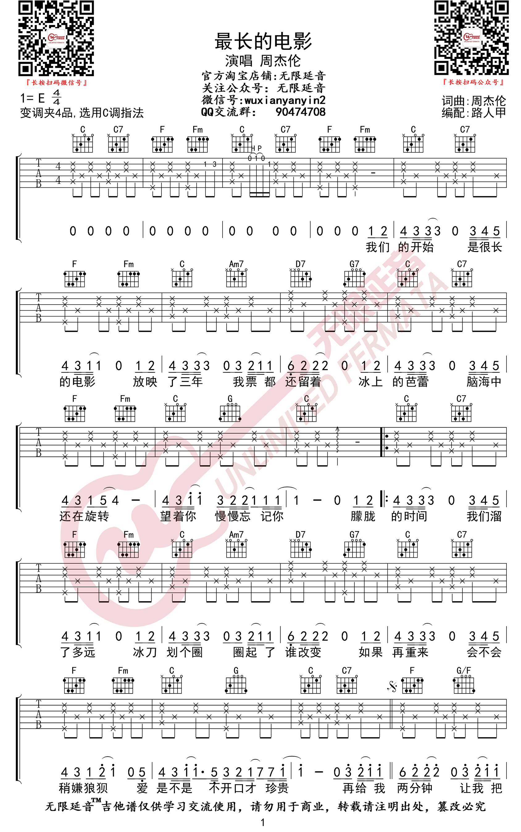 原调E,变调夹夹第四品,选用C调指法。最长的电影吉他弹唱谱,高清图片六线谱,感谢无限延音编配...