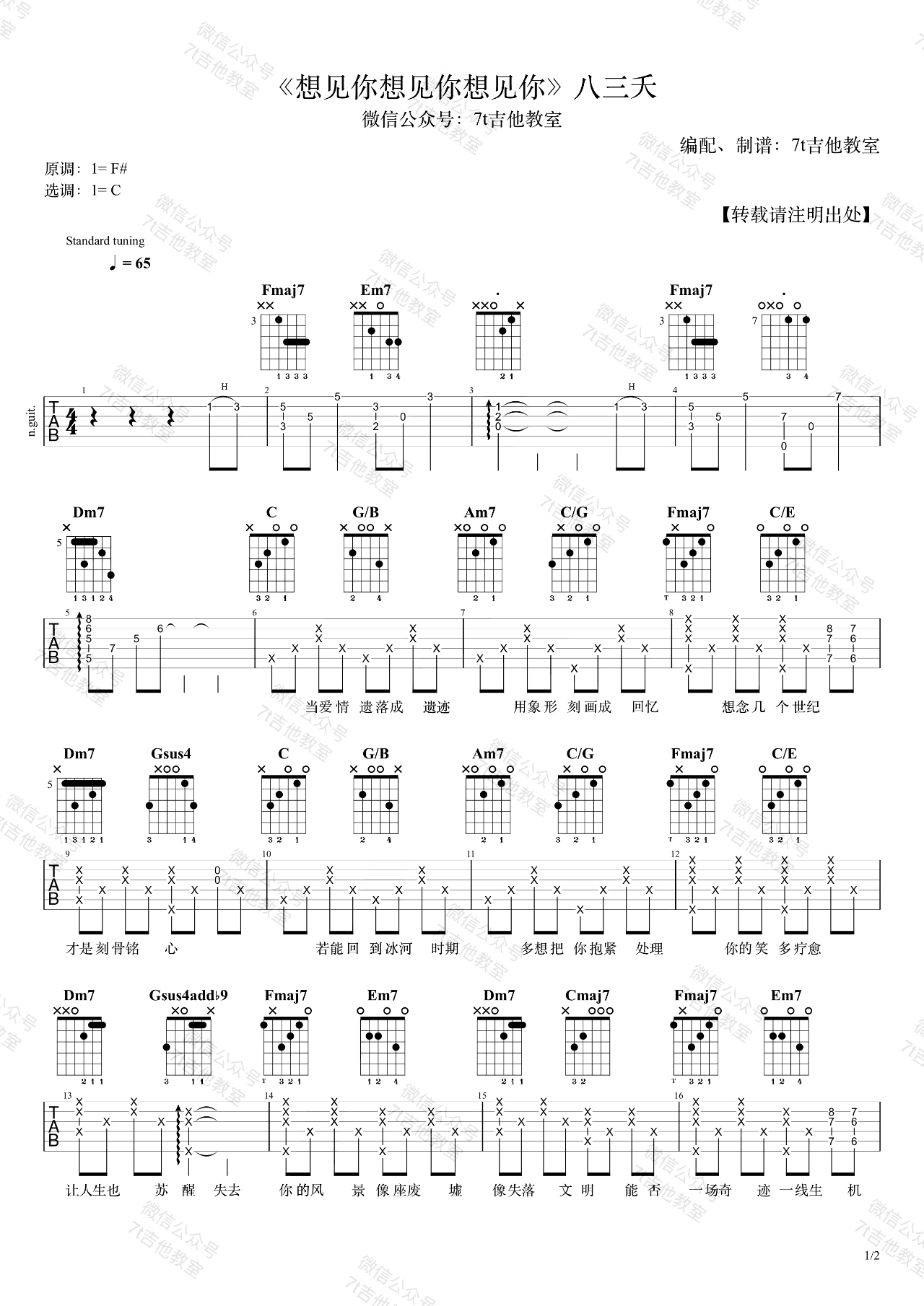 原调是F#大调,采用C大调的指法来编配,想唱原调的琴友用标准音调弦,变调夹夹在第6品就可以。7T吉他教室编配...