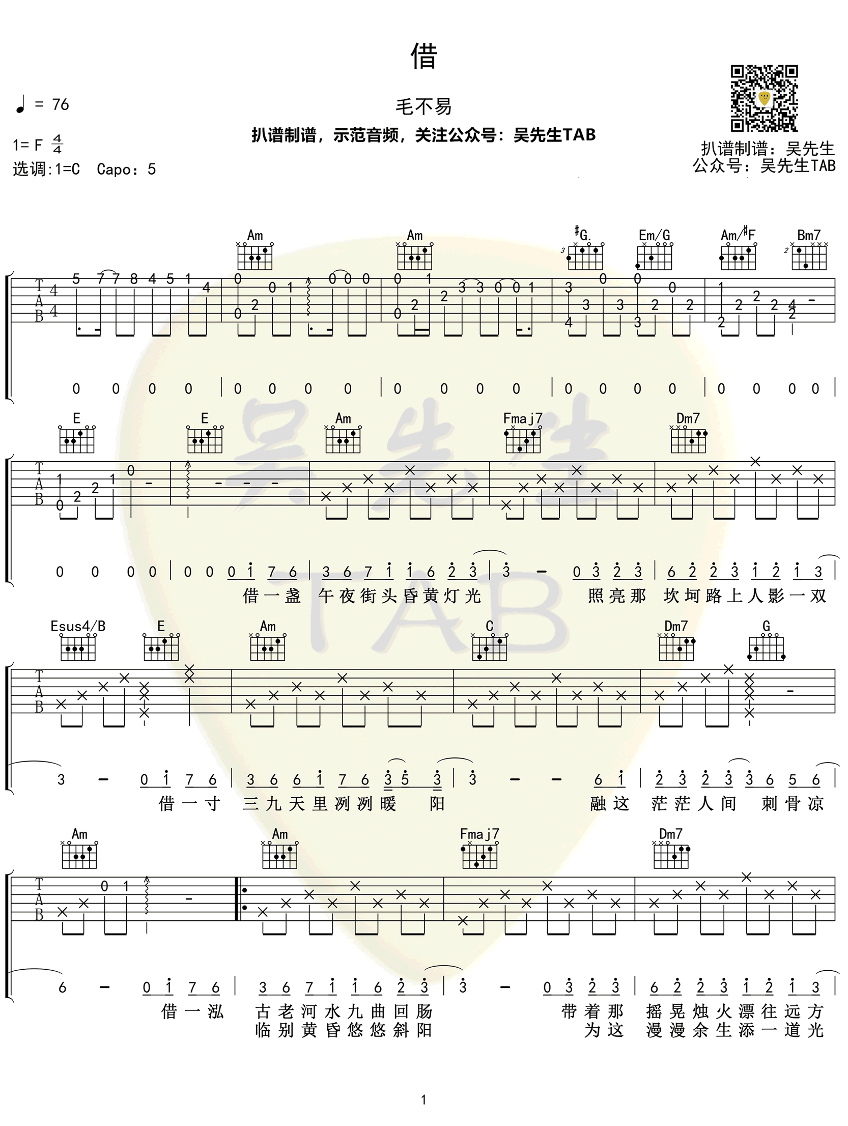 吉他毛不易《借》吉他谱_C调指法_弹唱六线谱