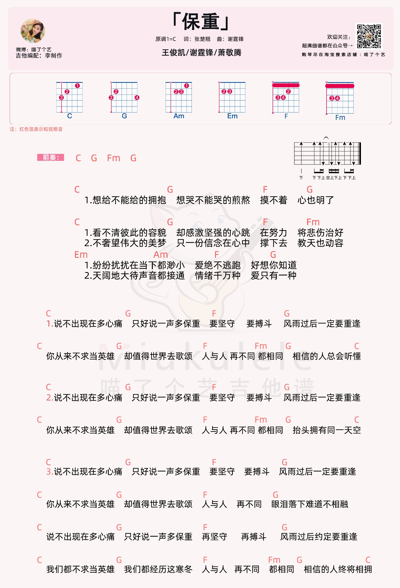 王俊凯/谢霆锋/萧敬腾《保重》吉他谱C调和弦谱...