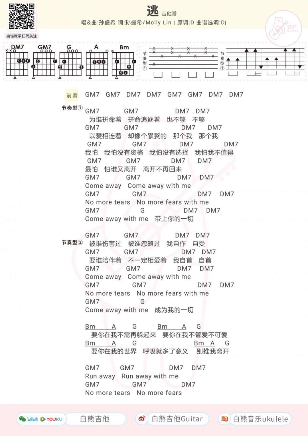 吉他孙盛希《逃》吉他谱 D调和弦谱附节奏