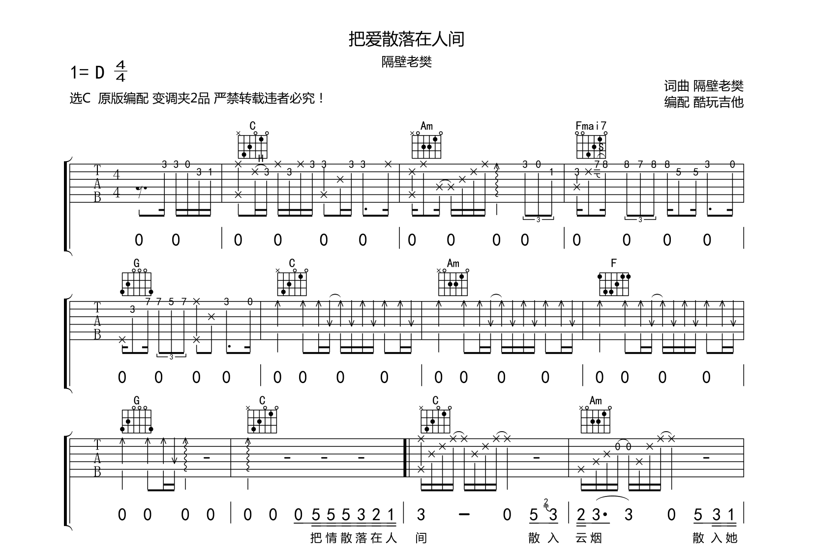 吉他把爱散落在人间吉他谱-隔壁老樊原版编配