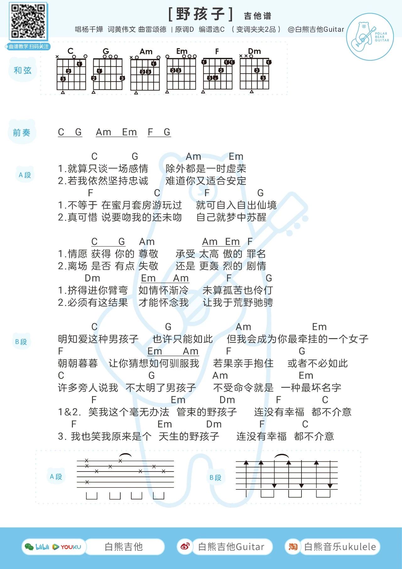 杨千嬅《野孩子》吉他谱C调和弦谱...
