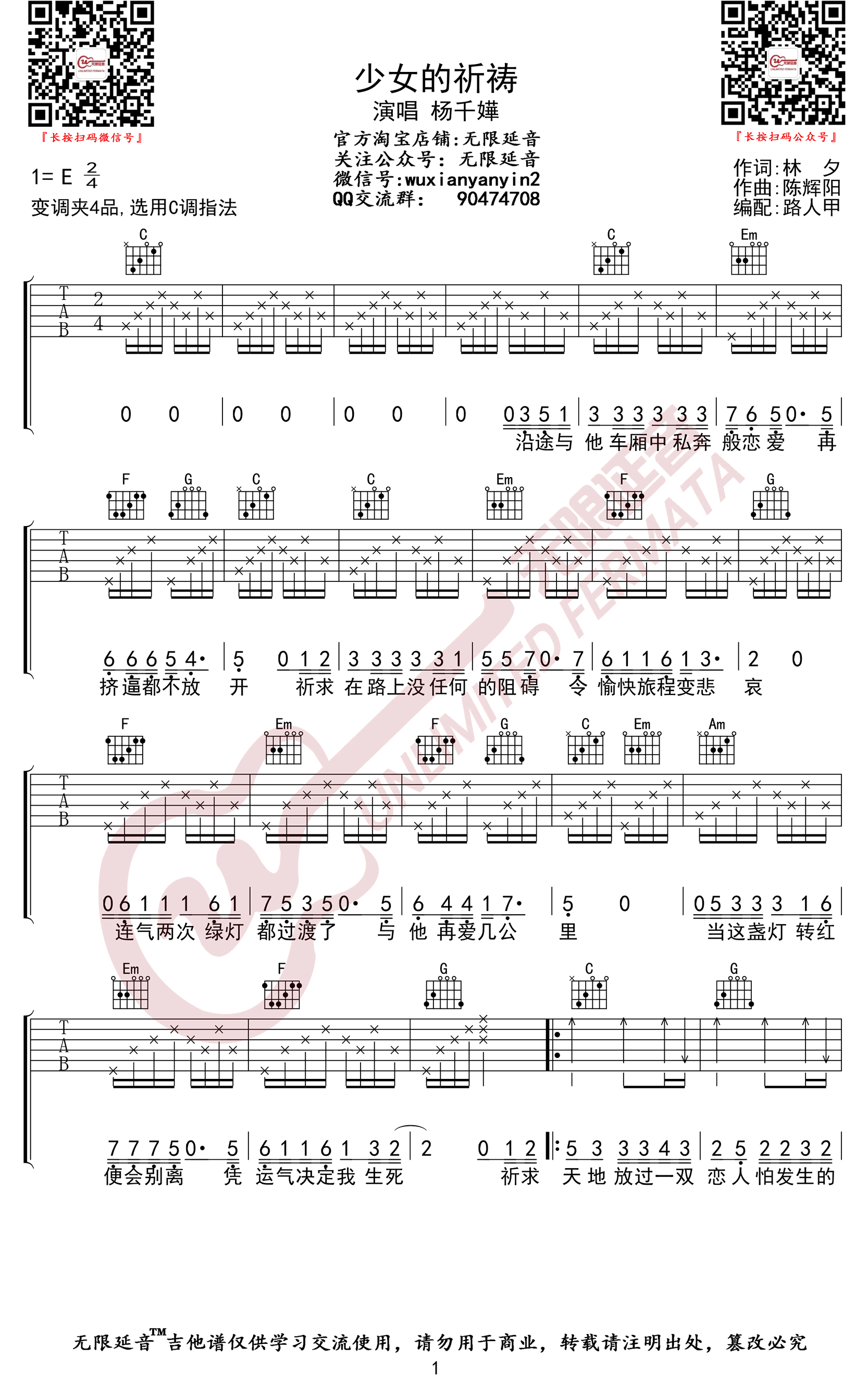 吉他少女的祈祷吉他谱_杨千嬅_C调_
