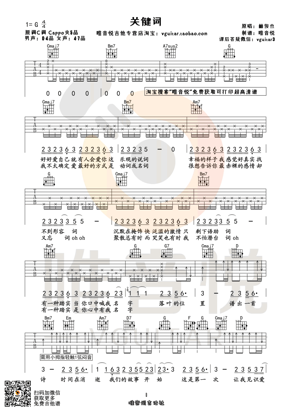 关键词六线谱,原调C,选用G调指法,大家就可以根据自己的音高来调整变调夹。唯音悦编配出品...