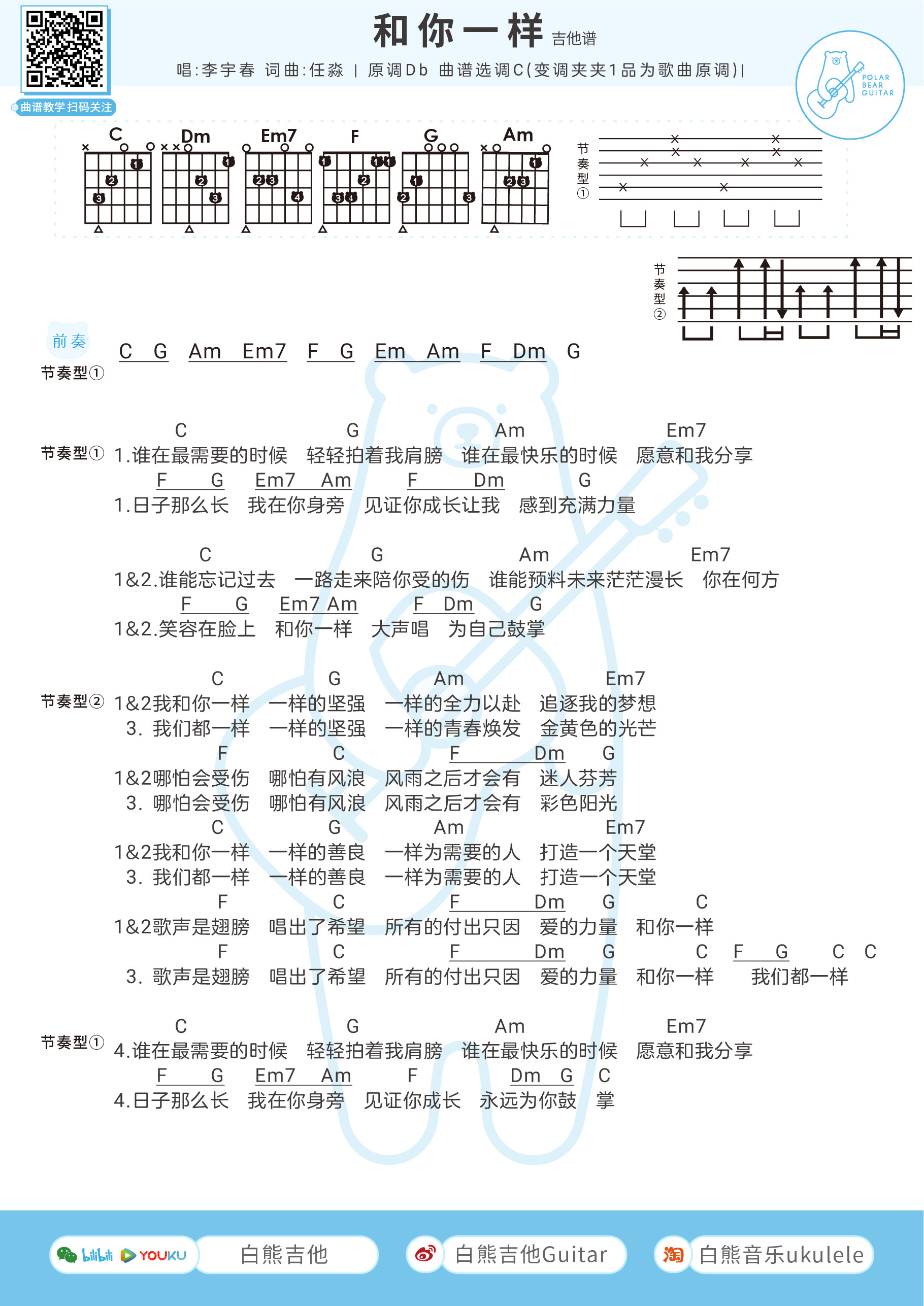 吉他李宇春《和你一样》吉他谱 C调和弦谱附节奏