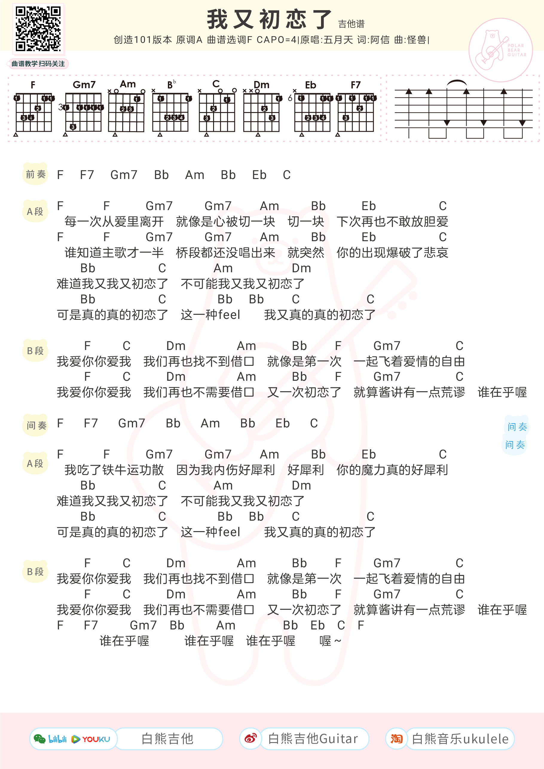 吉他五月天《我又初恋了》吉他谱 F调&C调和弦谱附节奏