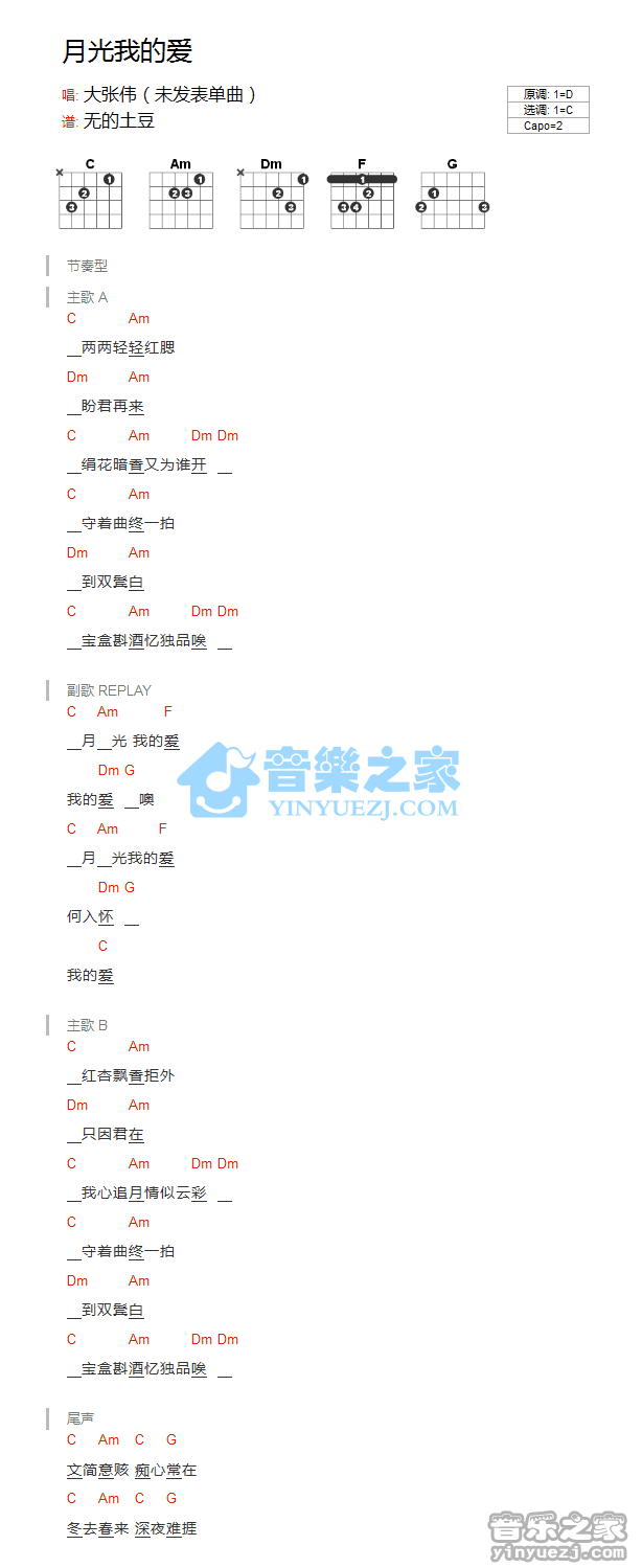 吉他大张伟《月光我的爱》吉他谱_吉他弹唱谱_YYZJ编配