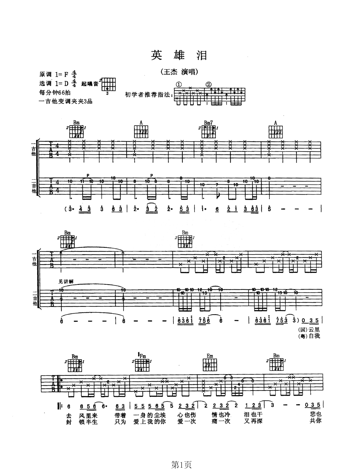 吉他王杰《英雄泪》吉他谱_吉他弹唱谱_YYZJ编配