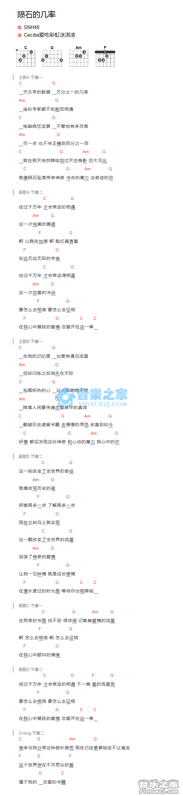 SNH48《陨石的机率》吉他和弦弹唱谱...