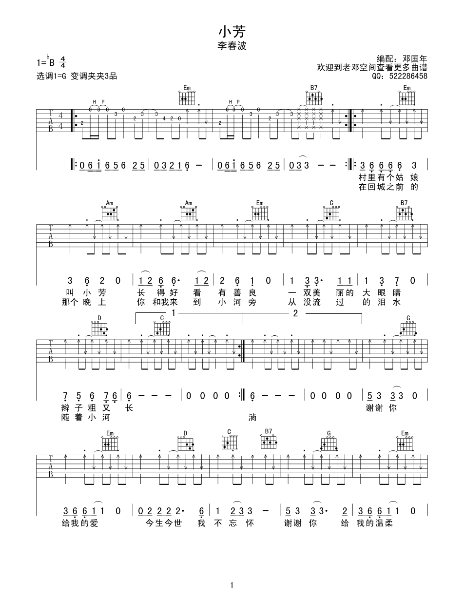 吉他李春波《小芳》吉他谱_吉他弹唱谱_邓国年编配