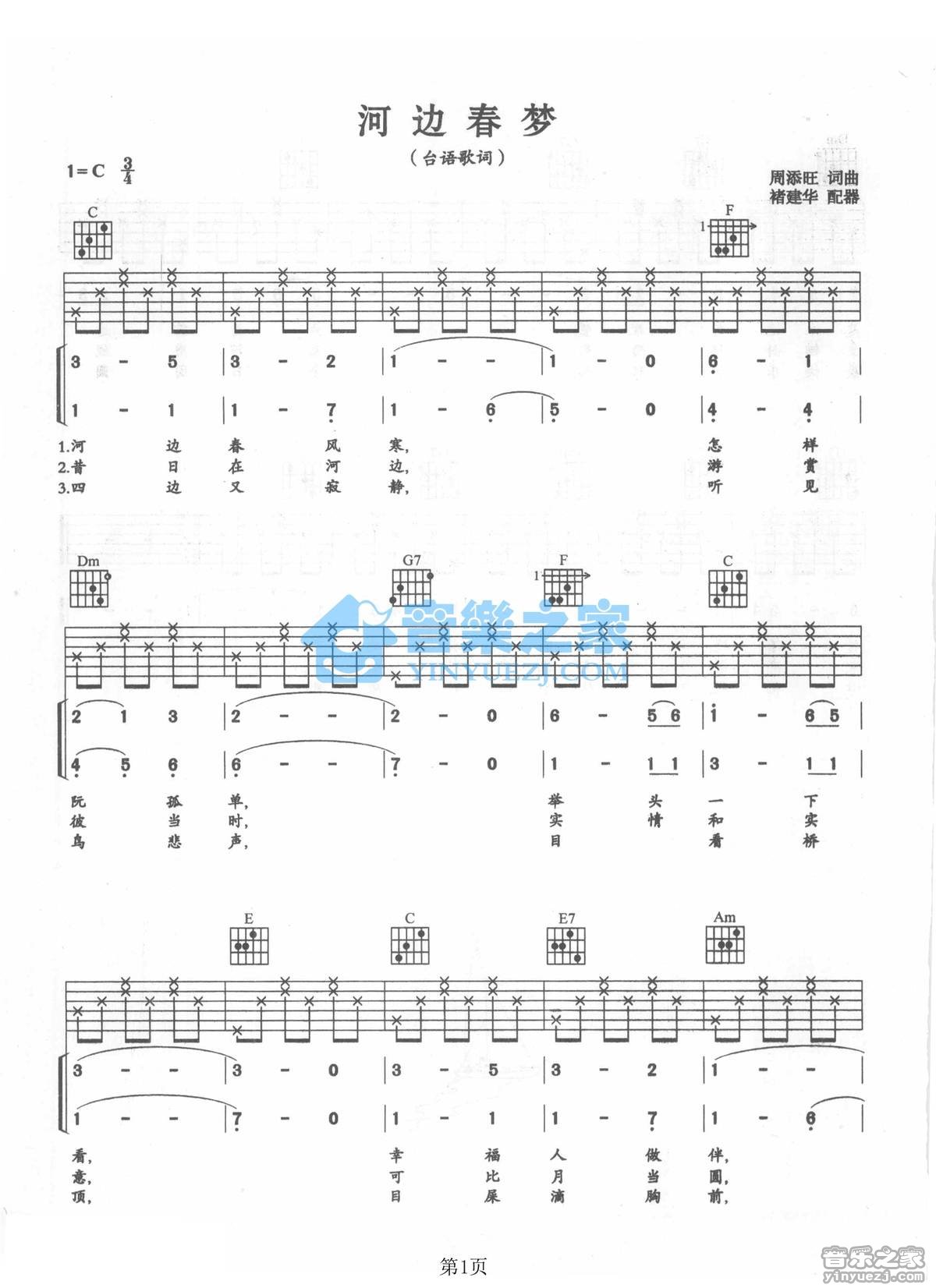吉他凤飞飞《河边春梦》吉他谱_吉他弹唱谱