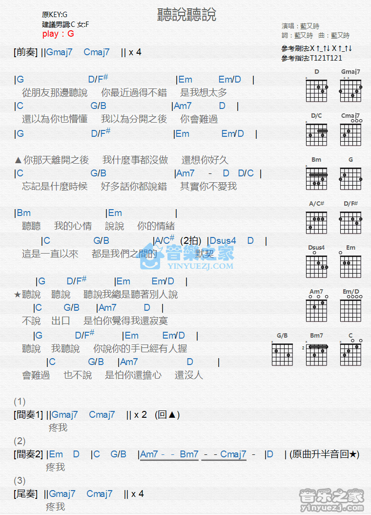 G调版蓝又时《听说听说》吉他和弦弹唱谱...