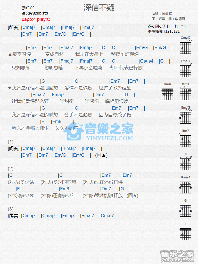 C调版蔡健雅《深信不疑》吉他和弦弹唱谱...