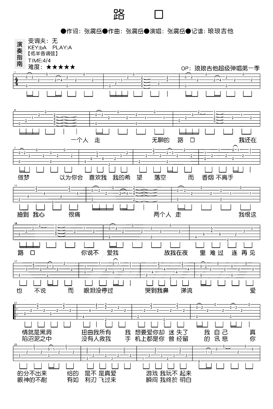 吉他张震岳《路口》吉他谱_吉他弹唱谱_琅琅吉他编配