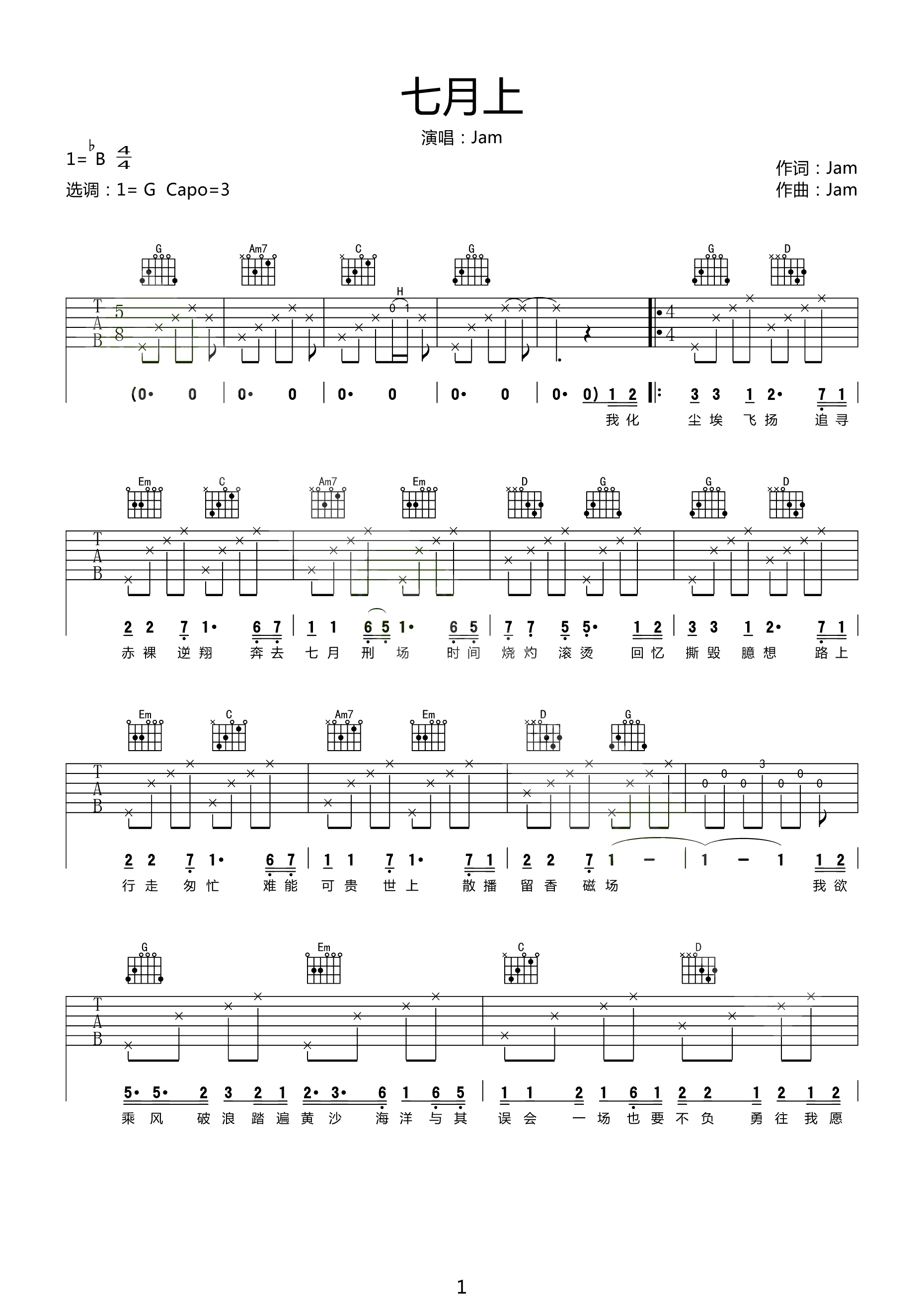 Jam《七月上》吉他谱_G调吉他弹唱谱...