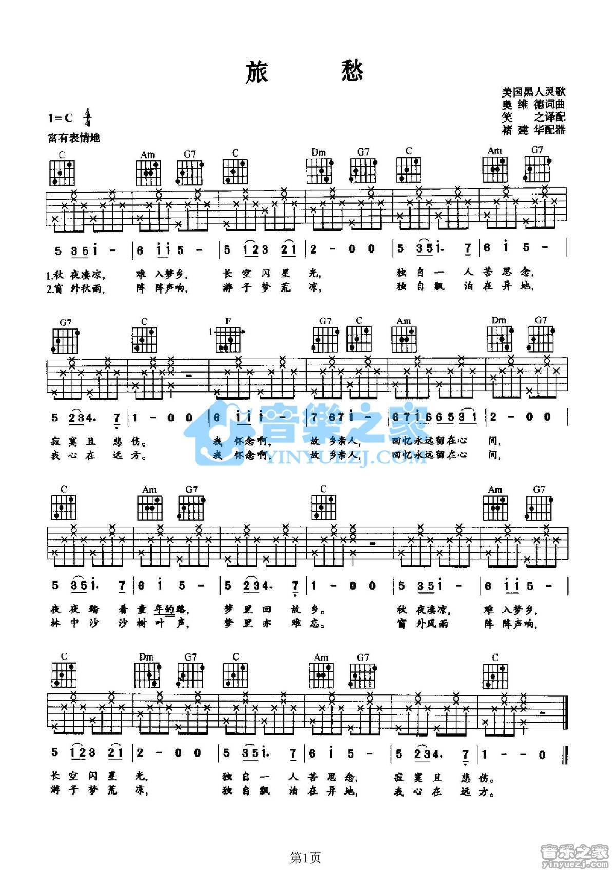 吉他美国黑人灵歌《旅愁》吉他谱_吉他弹唱谱