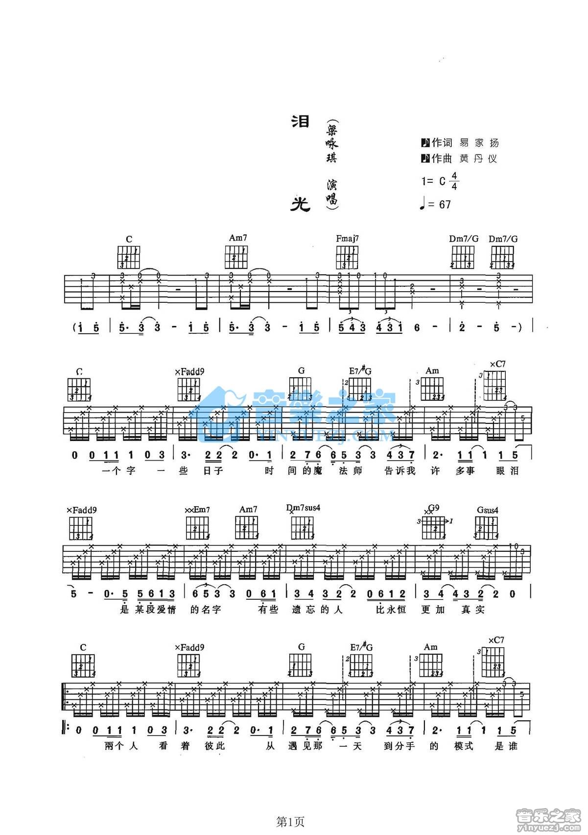 C调版梁咏琪《泪光》吉他弹唱六线谱...